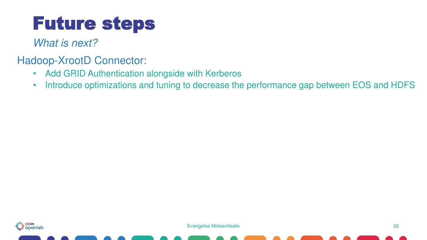 25 . Future steps What is next? Hadoop-XrootD Connector: • Add GRID Authentication alongside with Kerberos • Introduce optimizations and tuning to decrease the performance gap between EOS and HDFS Evangelos Motesnitsalis 25