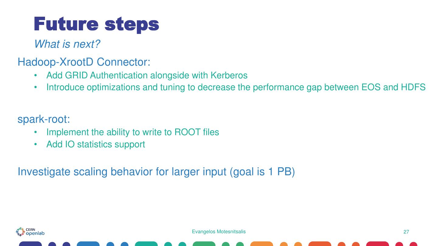 26 . Future steps What is next? Hadoop-XrootD Connector: • Add GRID Authentication alongside with Kerberos • Introduce optimizations and tuning to decrease the performance gap between EOS and HDFS spark-root: • Implement the ability to write to ROOT files • Add IO statistics support Evangelos Motesnitsalis 26