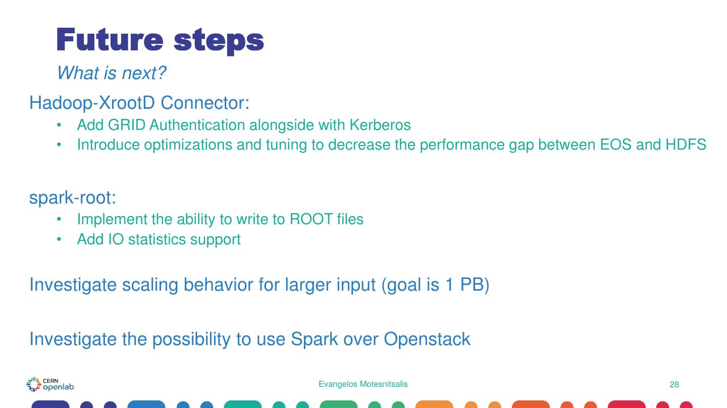 27 . Future steps What is next? Hadoop-XrootD Connector: • Add GRID Authentication alongside with Kerberos • Introduce optimizations and tuning to decrease the performance gap between EOS and HDFS spark-root: • Implement the ability to write to ROOT files • Add IO statistics support Investigate scaling behavior for larger input (goal is 1 PB) Evangelos Motesnitsalis 27