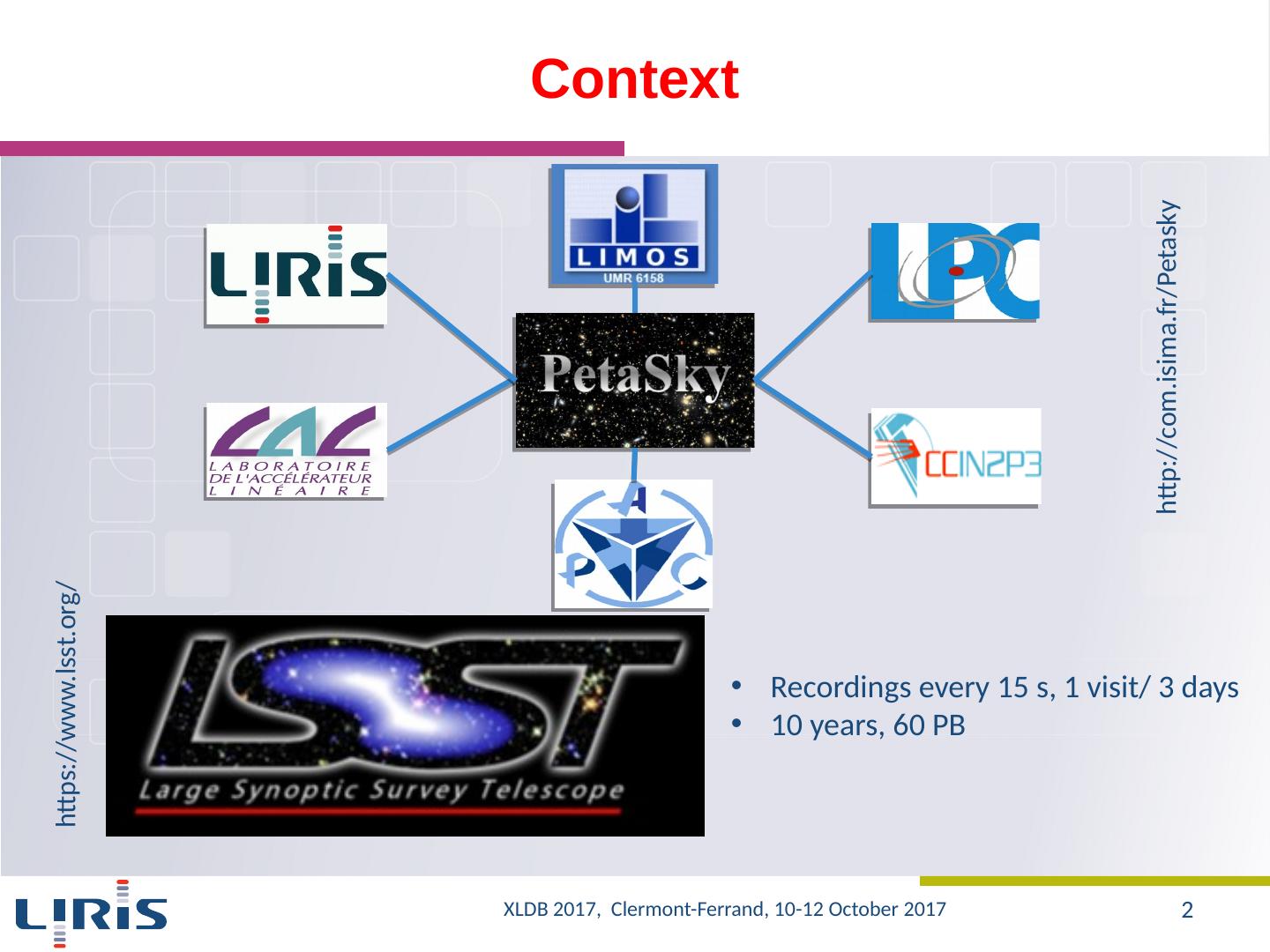 2 .Context Recordings every 15 s, 1 visit / 3 days 10 years , 60 PB http://com.isima.fr/Petasky https://www.lsst.org/ XLDB 2017, Clermont-Ferrand, 10-12 October 2017 2