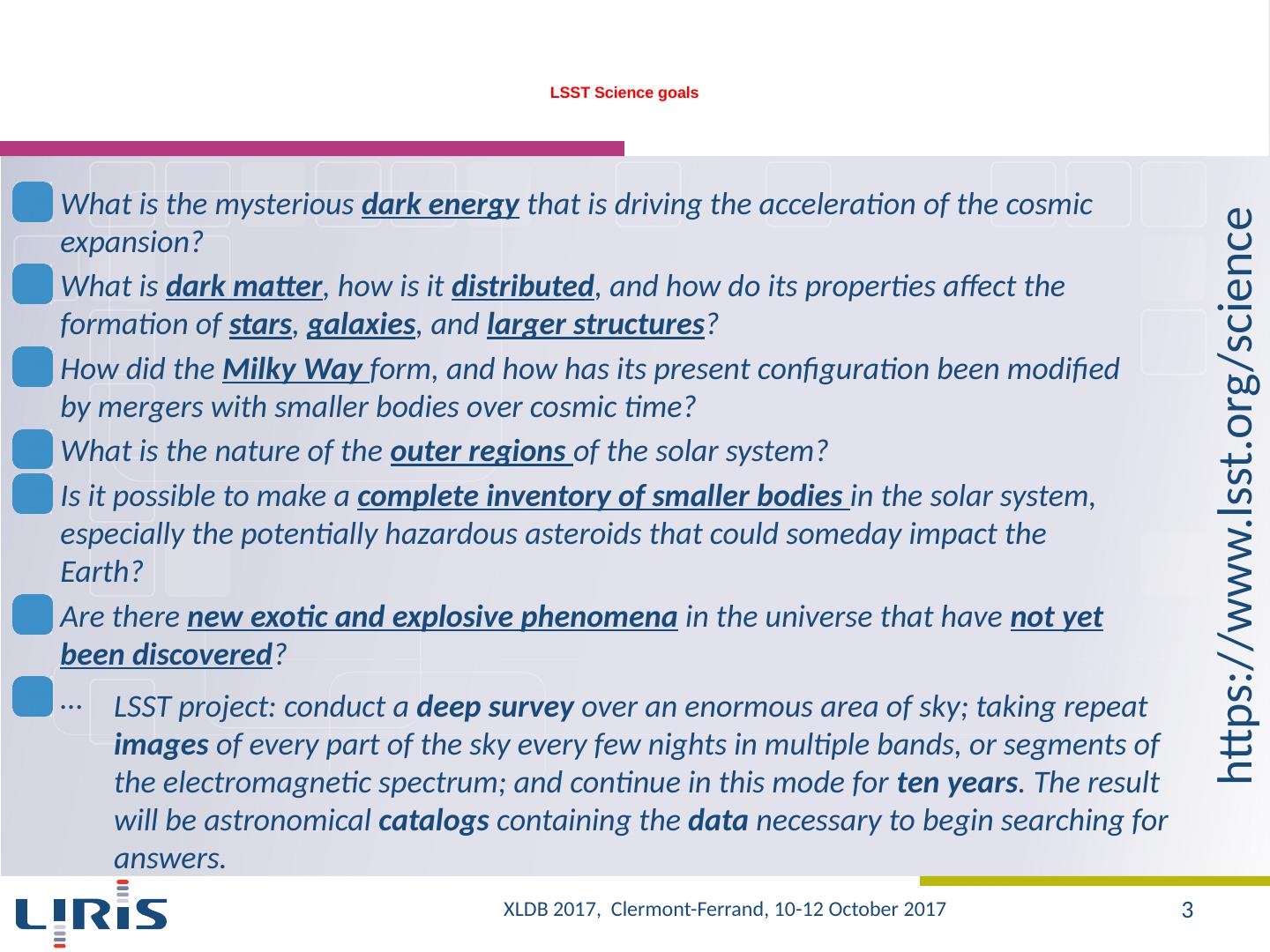 3 .LSST Science goals What is the mysterious dark energy that is driving the acceleration of the cosmic expansion? What is dark matter , how is it distributed , and how do its properties affect the formation of stars , galaxies , and larger structures ? How did the Milky Way form , and how has its present configuration been modified by mergers with smaller bodies over cosmic time? What is the nature of the outer regions of the solar system? Is it possible to make a complete inventory of smaller bodies in the solar system, especially the potentially hazardous asteroids that could someday impact the Earth ? Are there new exotic and explosive phenomena in the universe that have not yet been discovered ? … LSST project: conduct a deep survey over an enormous area of sky; taking repeat images of every part of the sky every few nights in multiple bands, or segments of the electromagnetic spectrum; and continue in this mode for ten years . The result will be astronomical catalogs containing the data necessary to begin searching for answers. https://www.lsst.org/science XLDB 2017, Clermont-Ferrand, 10-12 October 2017 3