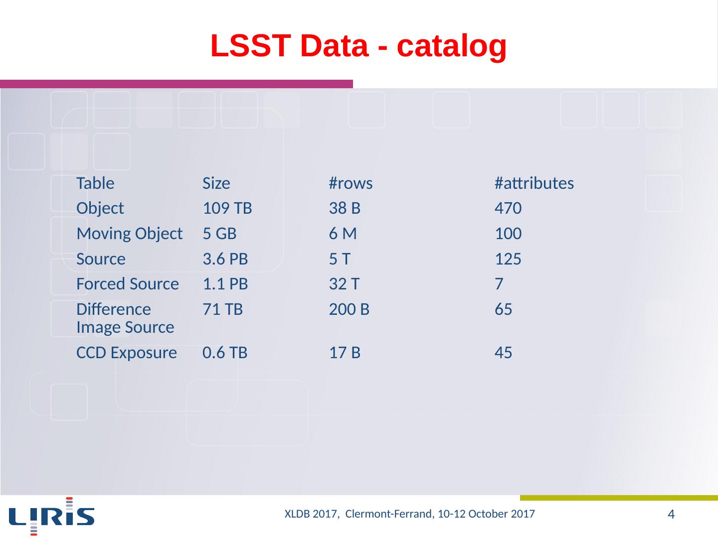 4 .LSST Data - catalog Table Size # rows # attributes Object 109 TB 38 B 470 Moving Object 5 GB 6 M 100 Source 3.6 PB 5 T 125 Forced Source 1.1 PB 32 T 7 Difference Image Source 71 TB 200 B 65 CCD Exposure 0.6 TB 17 B 45 XLDB 2017, Clermont-Ferrand, 10-12 October 2017 4