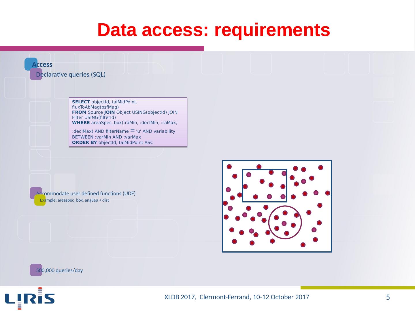 5 .Data access : requirements Access Declarative queries (SQL) Accommodate user defined functions (UDF) Example : areaspec_box , angSep < dist 500,000 queries / day SELECT objectId , taiMidPoint , fluxToAbMag ( psfMag ) FROM Source JOIN Object USING( objectId ) JOIN Filter USING( filterId ) WHERE areaSpec_box (: raMin , : declMin , : raMax , : declMax ) AND filterName = u AND variability BETWEEN : varMin AND : varMax ORDER BY objectId , taiMidPoint ASC XLDB 2017, Clermont-Ferrand, 10-12 October 2017 5
