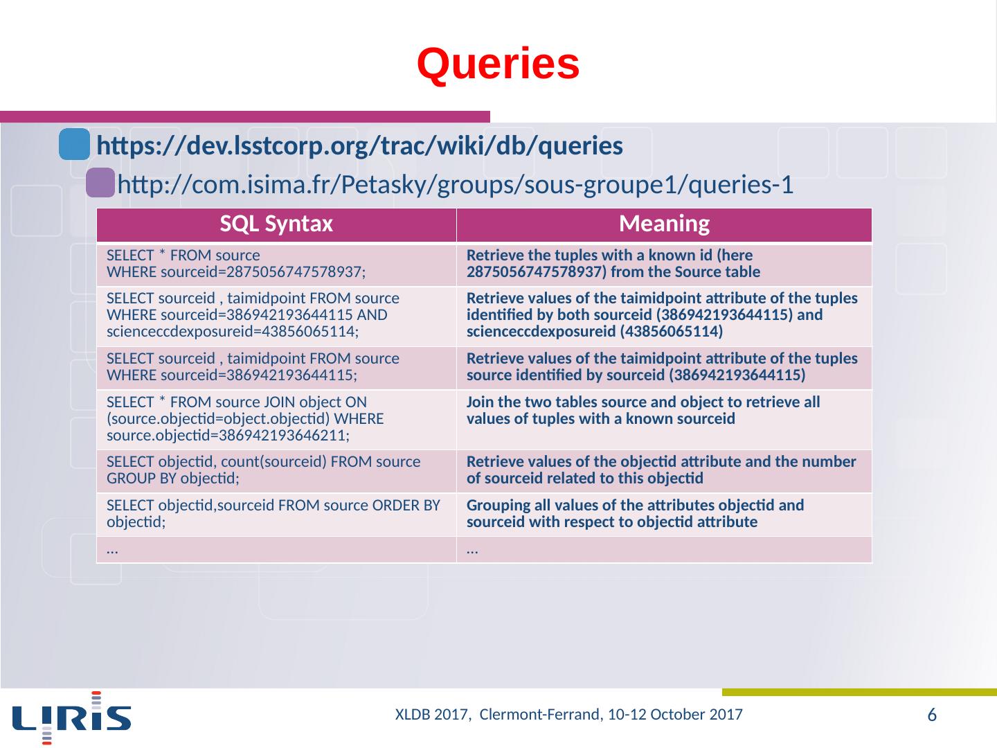 6 .Queries https://dev.lsstcorp.org/trac/wiki/db/queries http ://com.isima.fr/Petasky/groups/sous-groupe1/queries-1 SQL Syntax Meaning SELECT * FROM source WHERE sour ceid =2875056747578937; Retrieve the tuples with a known id (here 2875056747578937) from the Source table SELECT sourceid , taimidpoint FROM source WHERE sourceid =386942193644115 AND scienceccdexposureid =43856065114; Retrieve values of the taimidpoint attribute of the tuples identified by both sourceid (386942193644115) and sci enceccdexposureid (43856065114) SELECT sourceid , taimidpoint FROM source WHERE sourceid =386942193644115; Retrieve values of the taimidpoint attribute of the tuples source identified by sourceid (386942193644115) SELECT * FROM source JOIN object ON ( source.objectid = object.objectid ) WHERE source.objectid =386942193646211; Join the two tables source and object to retrieve all values of tuples with a known sourceid SELECT objectid , count( sourceid ) FROM source GROUP BY objectid ; Retrieve values of the objectid attribute and the number of sourceid related to this objectid SELECT objectid,sourceid FROM source ORDER BY objectid ; Grouping all values of the attributes objectid and sourceid with respect to objectid attribute … … XLDB 2017, Clermont-Ferrand, 10-12 October 2017 6