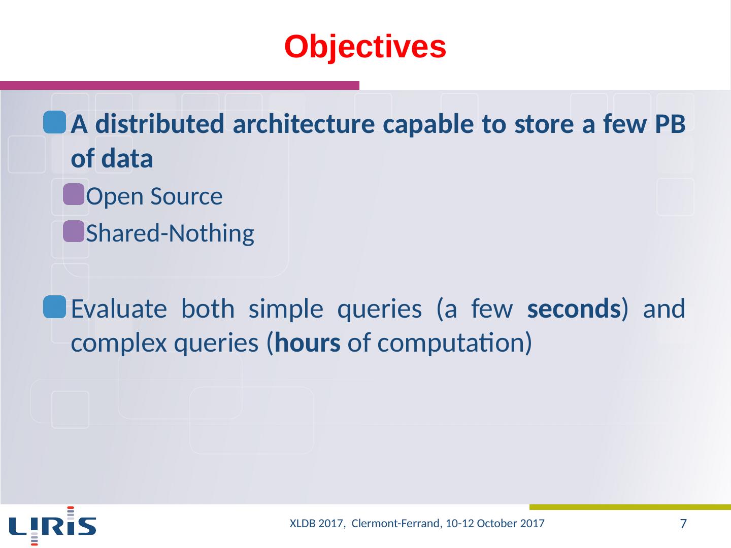 7 .Objectives A distributed architecture capable to store a few PB of data Open Source Shared -Nothing Evaluate both simple queries (a few seconds ) and complex queries ( hours of computation) XLDB 2017, Clermont-Ferrand, 10-12 October 2017 7