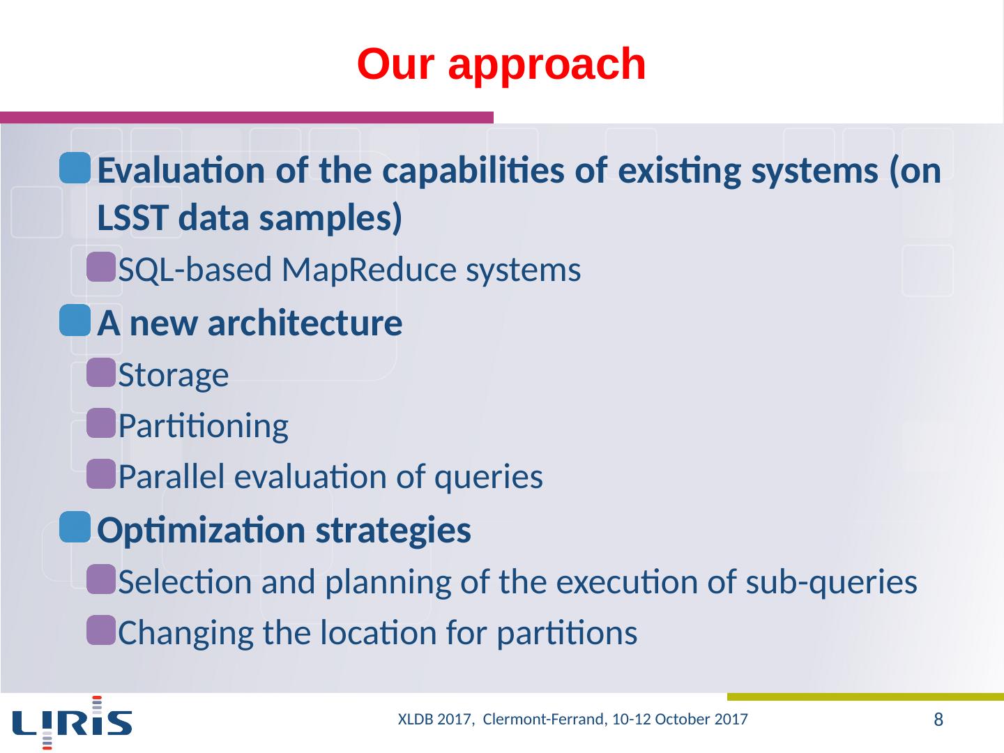 8 .Our approach Evaluation of the capabilities of existing systems (on LSST data samples) SQL-based MapReduce systems A new architecture Storage Partitioning Parallel evaluation of queries Optimization strategies Selection and planning of the execution of sub-queries Changing the location for partitions XLDB 2017, Clermont-Ferrand, 10-12 October 2017 8