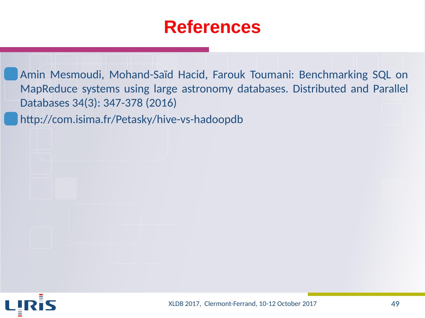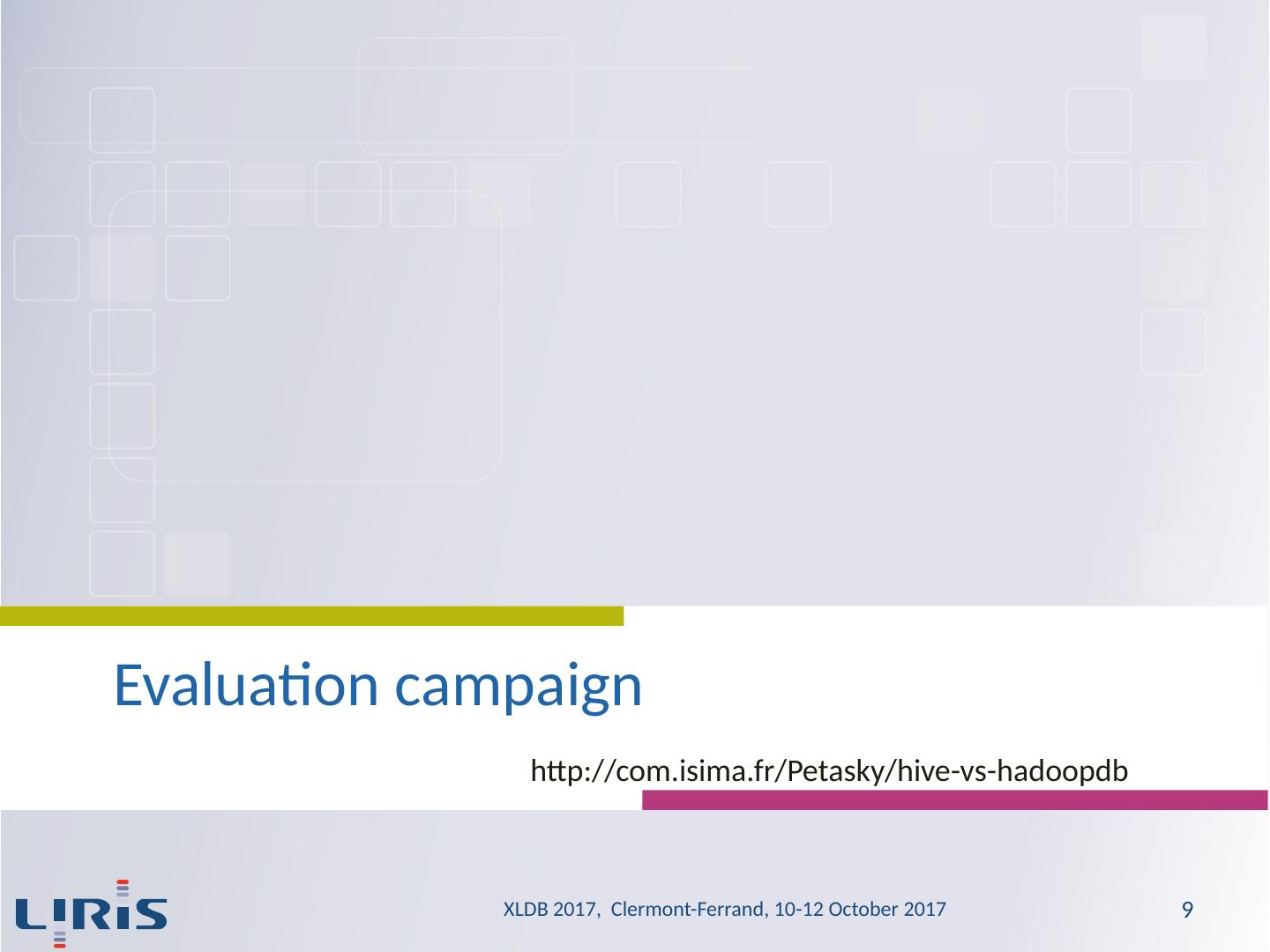 9 .Evaluation campaign http ://com.isima.fr/Petasky/hive-vs-hadoopdb XLDB 2017, Clermont-Ferrand, 10-12 October 2017 9