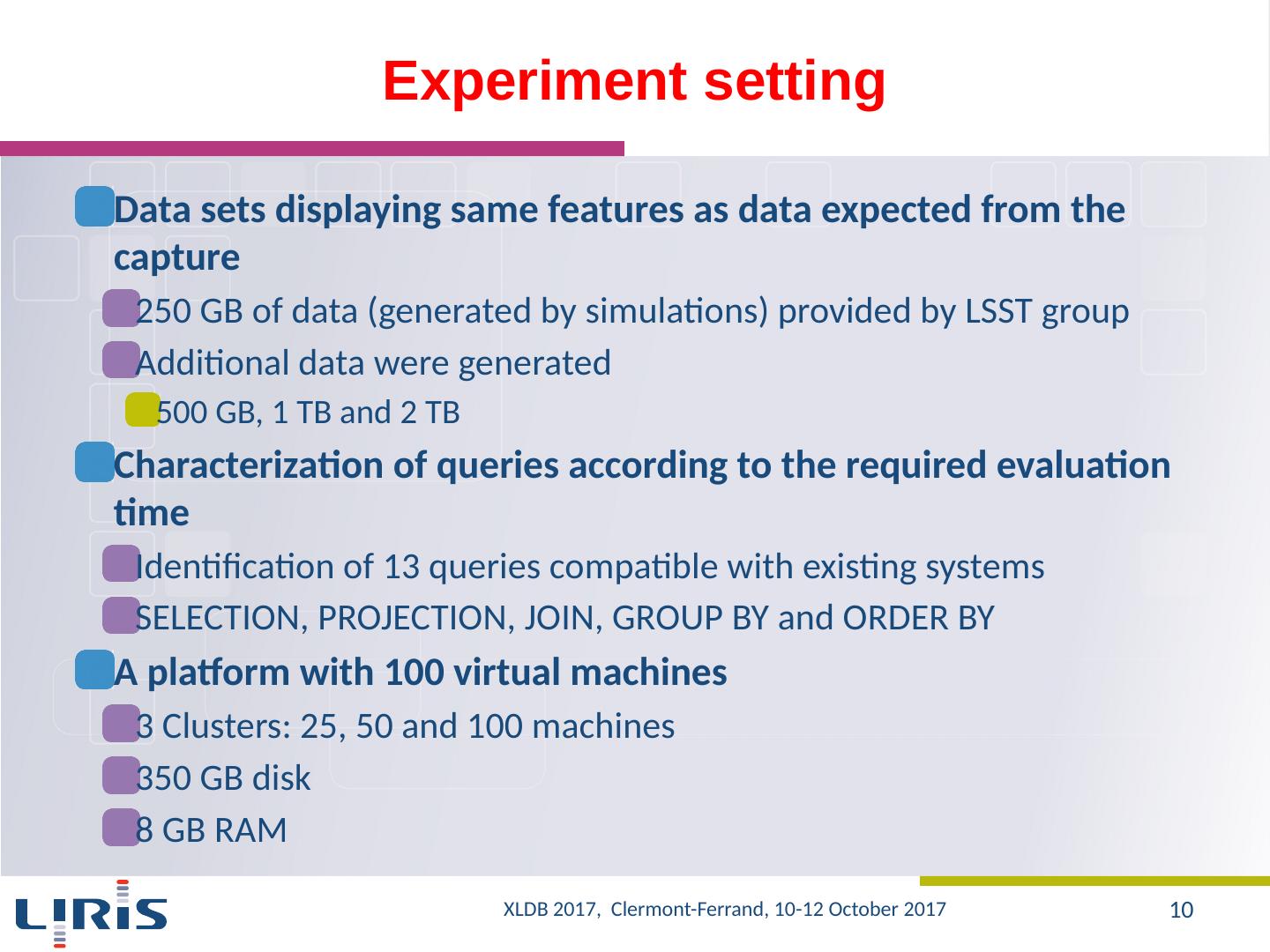 10 .Experiment setting Data sets displaying same features as data expected from the capture 250 GB of data ( generated by simulations) provided by LSST group Additional data were generated 500 GB, 1 TB and 2 TB Characterization of queries according to the required evaluation time Identification of 13 queries compatible with existing systems SELECTION, PROJECTION, JOIN, GROUP BY and ORDER BY A platform with 100 virtual machines 3 Clusters: 25, 50 and 100 machines 350 GB disk 8 GB RAM XLDB 2017, Clermont-Ferrand, 10-12 October 2017 10