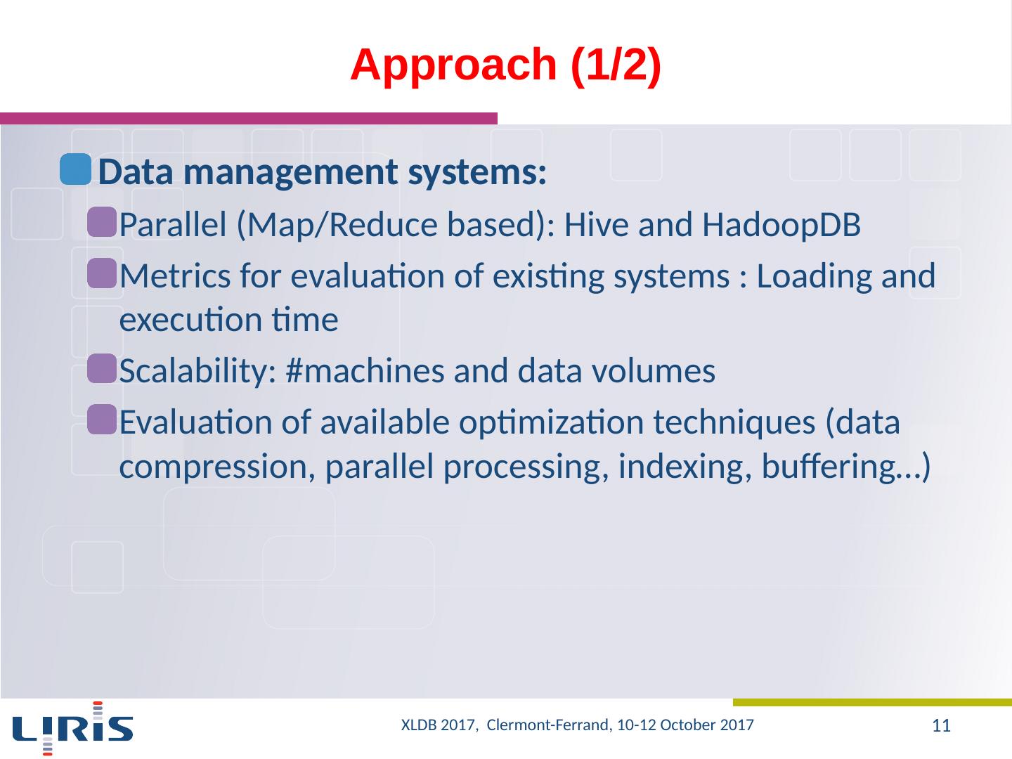 11 .Approach (1/2) Data management systems : Parallel ( Map / Reduce based ): Hive and HadoopDB Metrics for evaluation of existing systems : Loading and execution time Scalability : #machines and data volumes Evaluation of available optimization techniques (data compression, parallel processing , indexing , buffering …) XLDB 2017, Clermont-Ferrand, 10-12 October 2017 11
