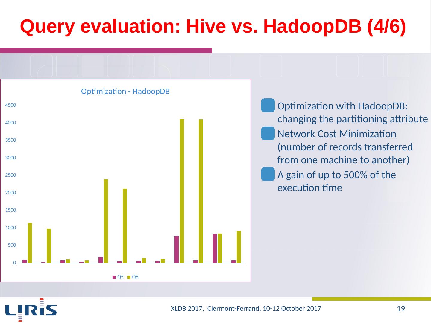 19 .Query evaluation : Hive vs. HadoopDB (4/6) Optimization with HadoopDB : changing the partitioning attribute Network Cost Minimization (number of records transferred from one machine to another ) A gain of up to 500% of the execution time XLDB 2017, Clermont-Ferrand, 10-12 October 2017 19