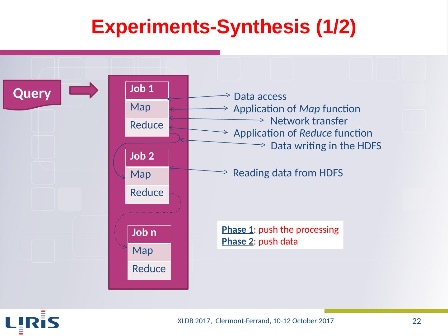 22 .Experiments-Synthesis (1/2) Query Job 1 Map Reduce Job 2 Map Reduce Job n Map Reduce Application of Map function Application of Reduce function Network transfer Data writing in the HDFS Reading data from HDFS Data access Phase 1 : push the processing Phase 2 : push data XLDB 2017, Clermont-Ferrand, 10-12 October 2017 22