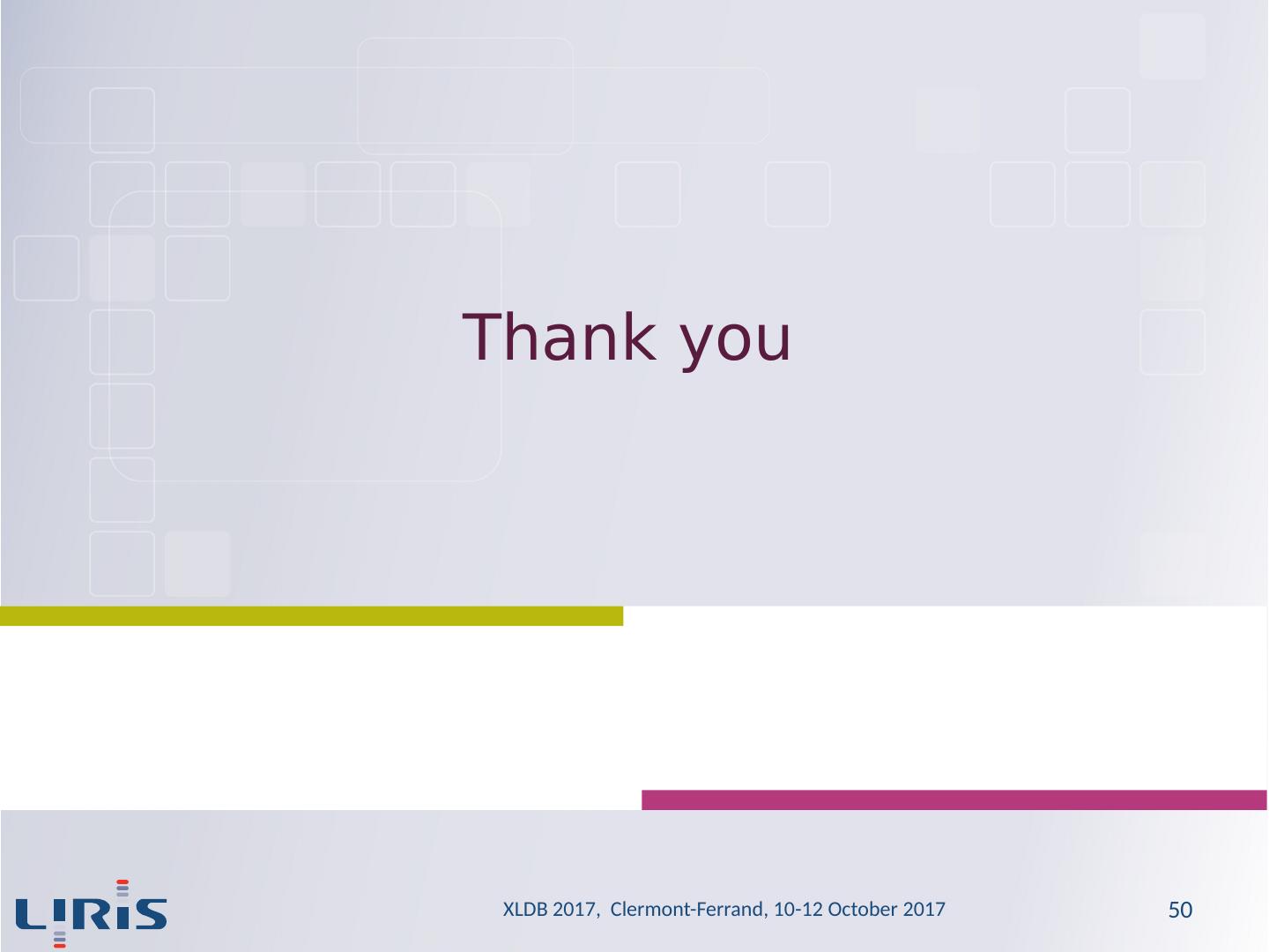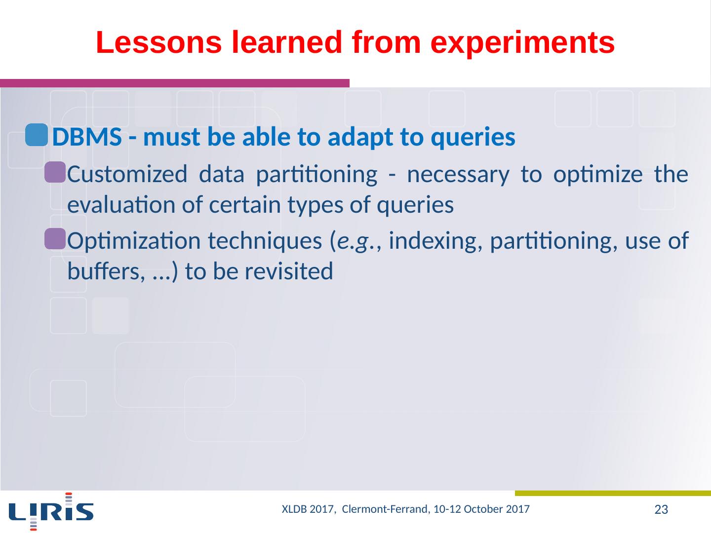 23 .DBMS - must be able to adapt to queries Customized data partitioning - necessary to optimize the evaluation of certain types of queries Optimization techniques ( e.g. , indexing, partitioning , use of buffers, ...) to be revisited Lessons learned from experiments XLDB 2017, Clermont-Ferrand, 10-12 October 2017 23