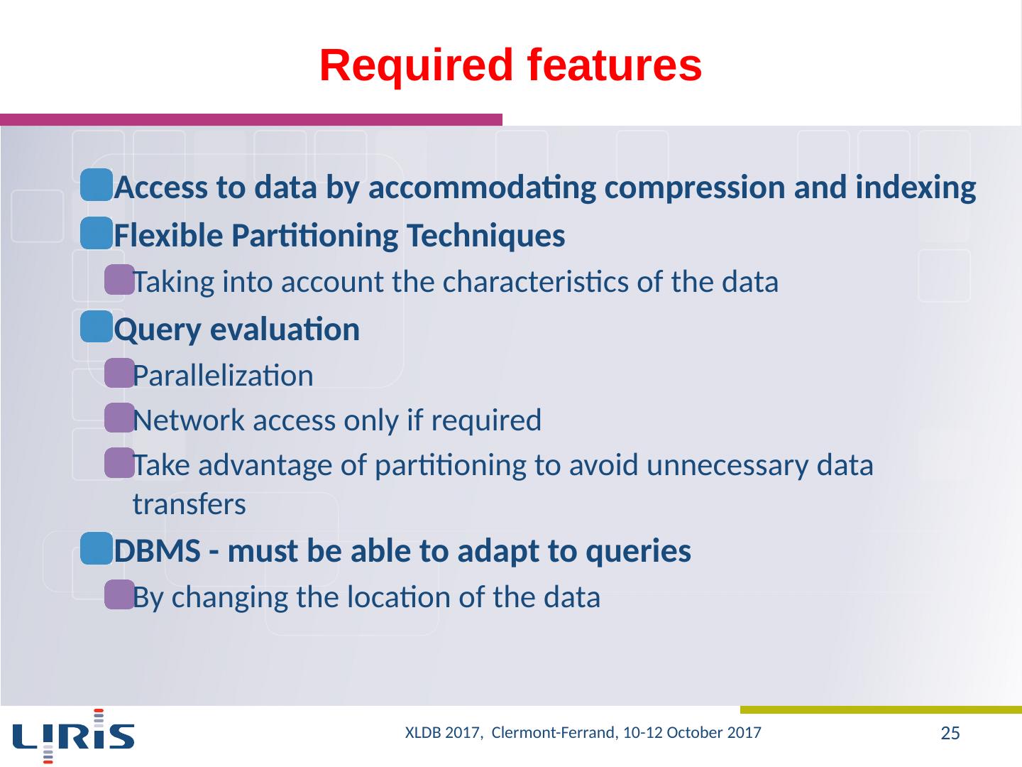 25 .Required features Access to data by accommodating compression and indexing Flexible Partitioning Techniques Taking into account the characteristics of the data Query evaluation Parallelization Network access only if required Take advantage of partitioning to avoid unnecessary data transfers DBMS - must be able to adapt to queries By changing the location of the data XLDB 2017, Clermont-Ferrand, 10-12 October 2017 25