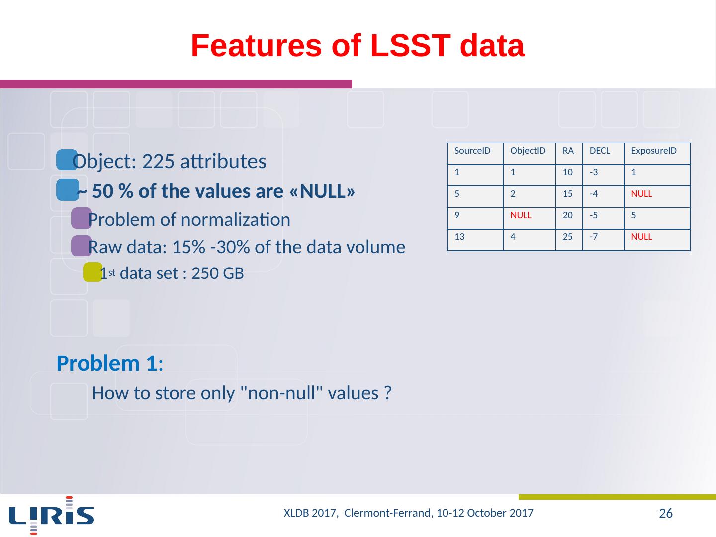 26 .Features of LSST data Object : 225 attributes ~ 50 % of the values are «NULL» Problem of normalization Raw data: 15% -30% of the data volume 1 st data set : 250 GB SourceID ObjectID RA DECL ExposureID 1 1 10 -3 1 5 2 15 -4 NULL 9 NULL 20 -5 5 13 4 25 -7 NULL Problem 1 : How to store only "non-null" values ? XLDB 2017, Clermont-Ferrand, 10-12 October 2017 26