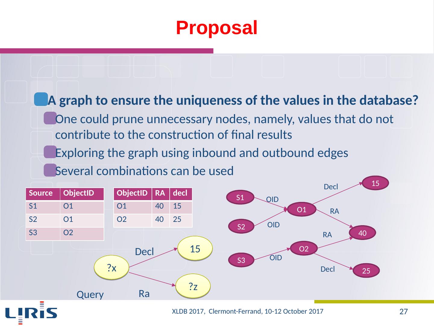 27 .Proposal A graph to ensure the uniqueness of the values in the database? One could prune unnecessary nodes, namely, values that do not contribute to the construction of final results Exploring the graph using inbound and outbound edges Several combinations can be used Source ObjectID S1 O1 S2 O1 S3 O2 ObjectID RA decl O1 40 15 O2 40 25 S1 S3 S2 O1 O2 OID OID OID 40 RA RA 15 Decl Decl 25 ?x 15 ?z D ecl Ra Query XLDB 2017, Clermont-Ferrand, 10-12 October 2017 27