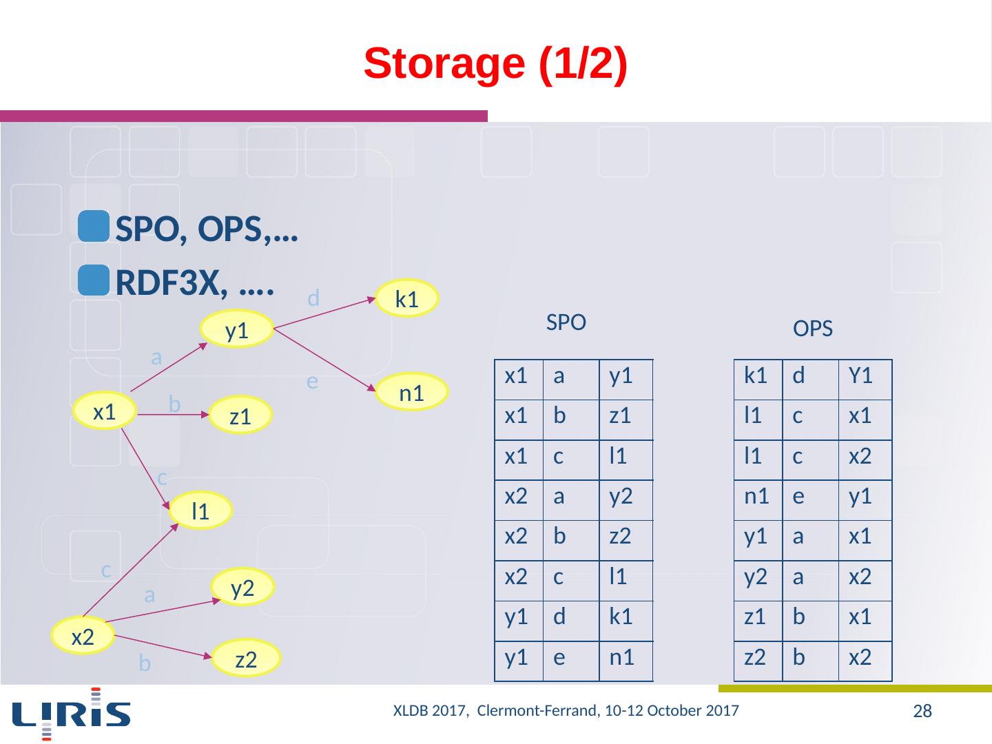 28 .Storage (1/2) SPO, OPS,… RDF3X, …. x1 l1 z1 n1 k1 a b c d e y1 z2 x2 y2 a b c x1 a y1 x1 b z1 x1 c l1 x2 a y2 x2 b z2 x2 c l1 y1 d k1 y1 e n1 SPO k1 d Y1 l1 c x1 l1 c x2 n1 e y1 y1 a x1 y2 a x2 z1 b x1 z2 b x2 OPS XLDB 2017, Clermont-Ferrand, 10-12 October 2017 28