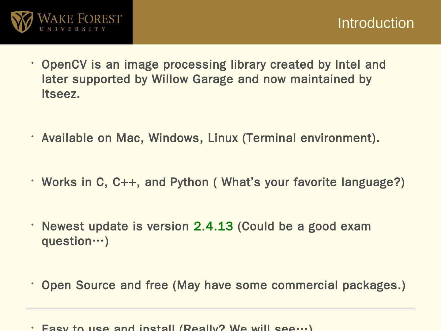 OpenCV is an image processing library created by Intel and later supported by Willow Garage and now maintained by Itseez. Available on Mac, Windows, Linux ...