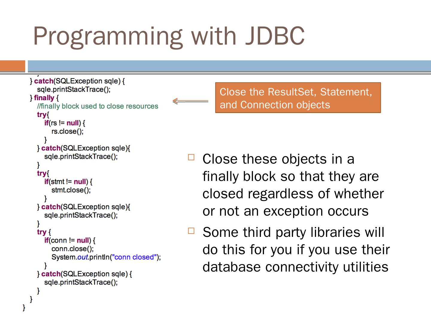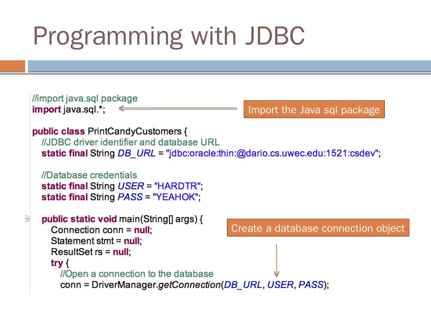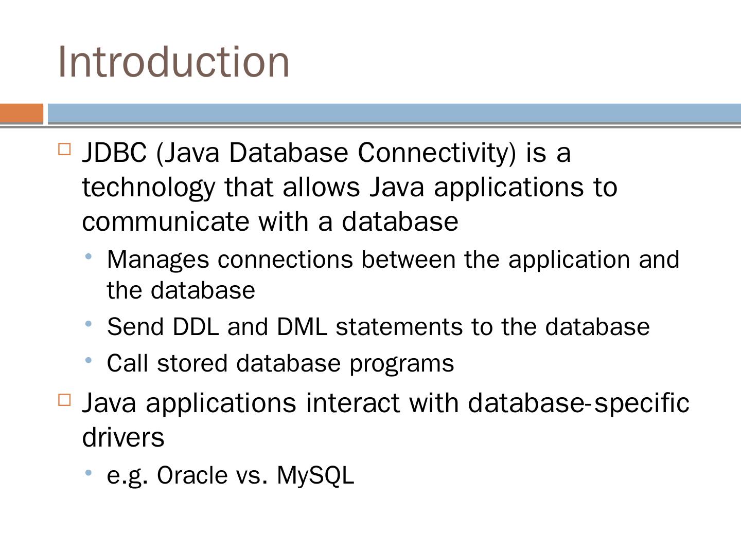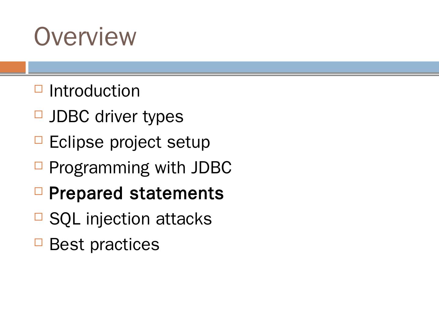 Introduction; JDBC driver types; Eclipse project setup; Programming with JDBC; Prepared statements; SQL injection attacks; Best practices. Introduction.
