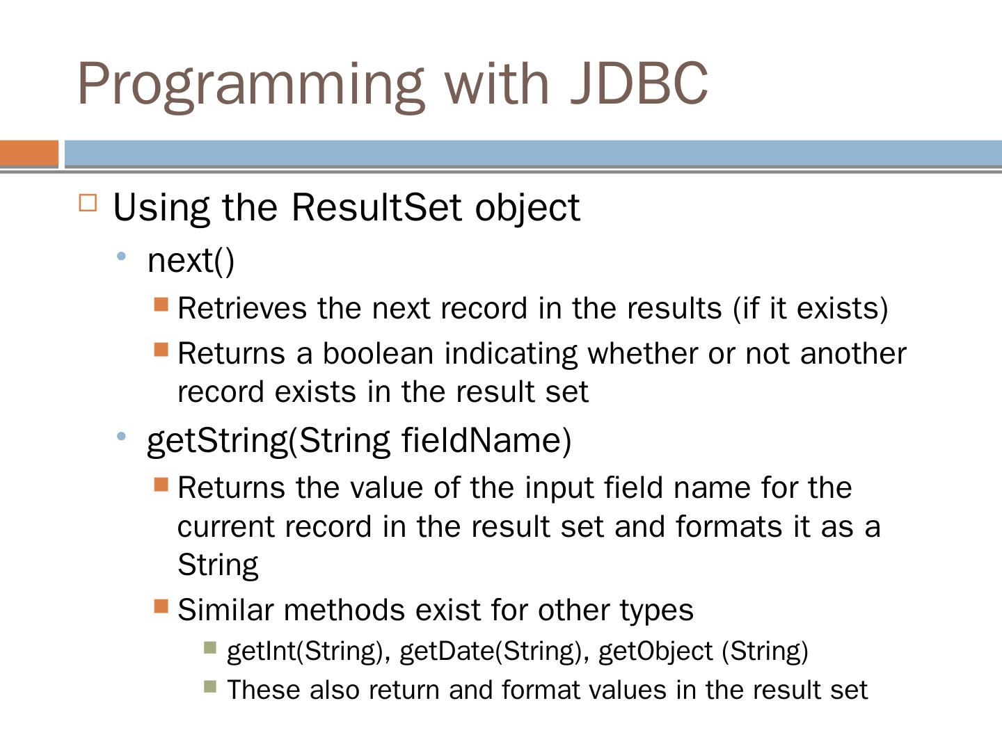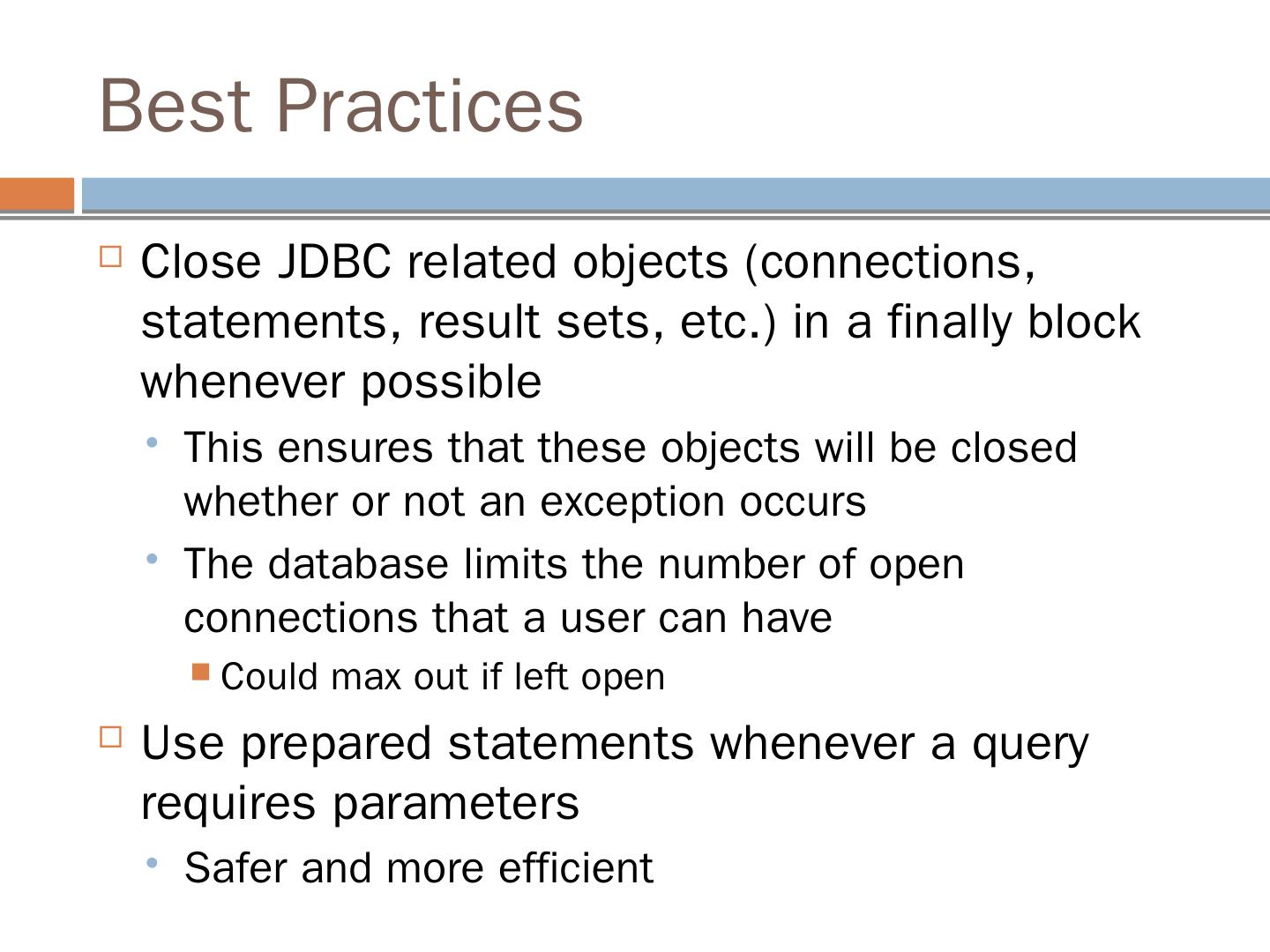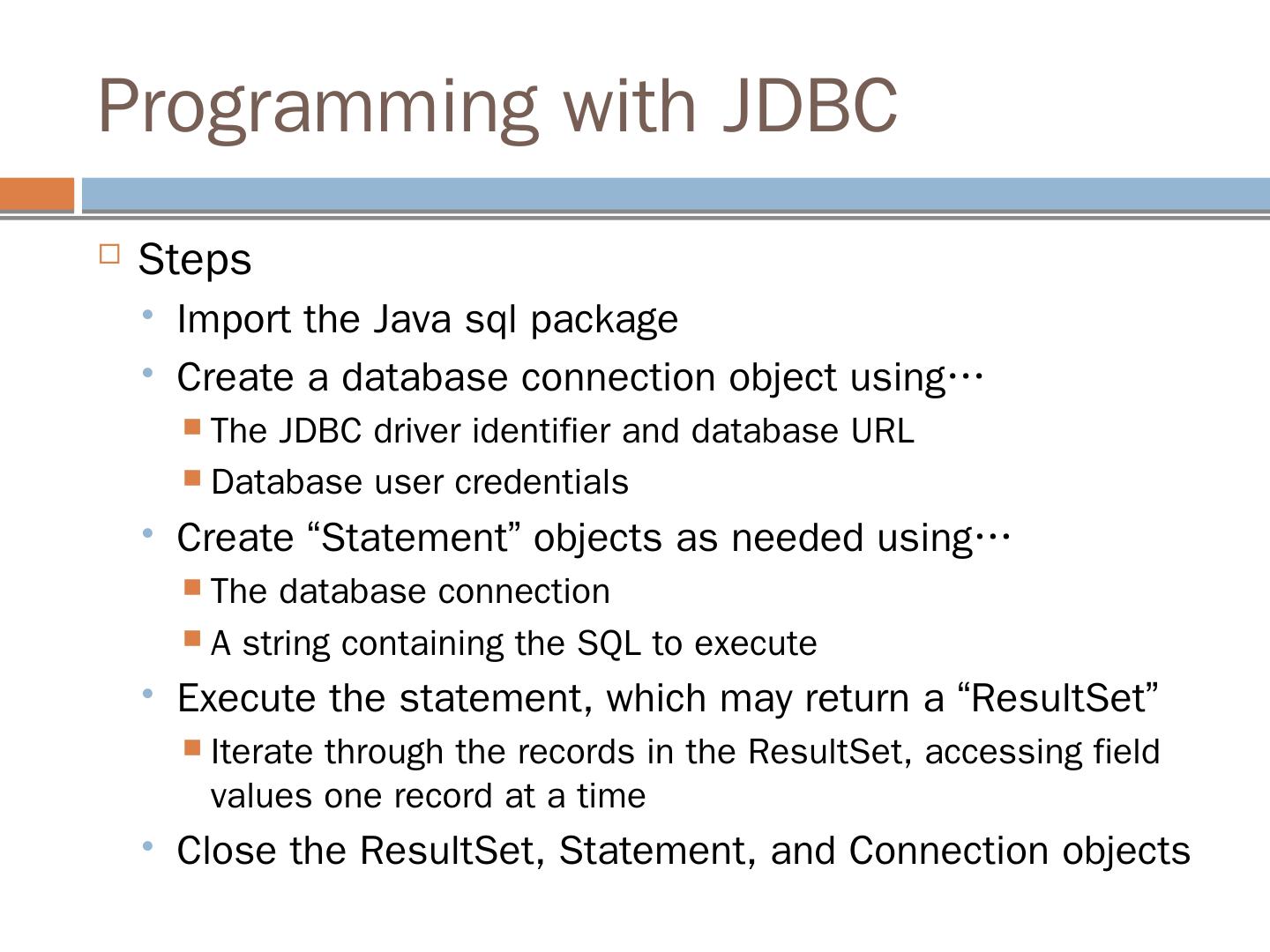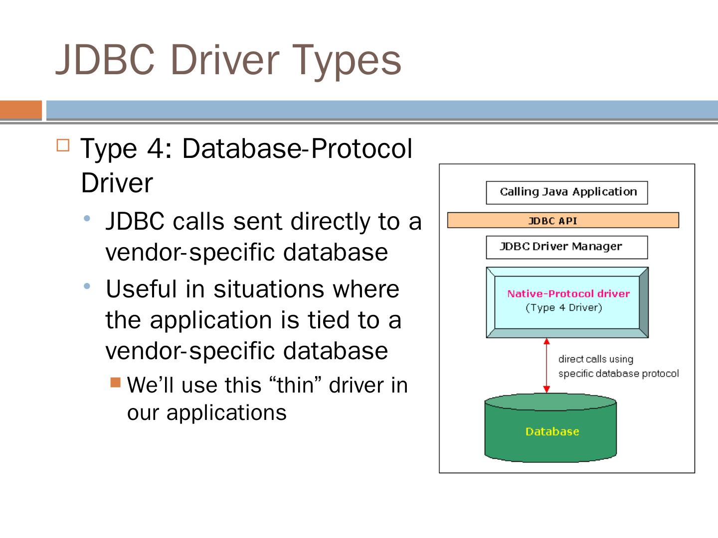 Introduction; JDBC driver types; Eclipse project setup; Programming with JDBC; Prepared statements; SQL injection attacks; Best practices. Introduction.
