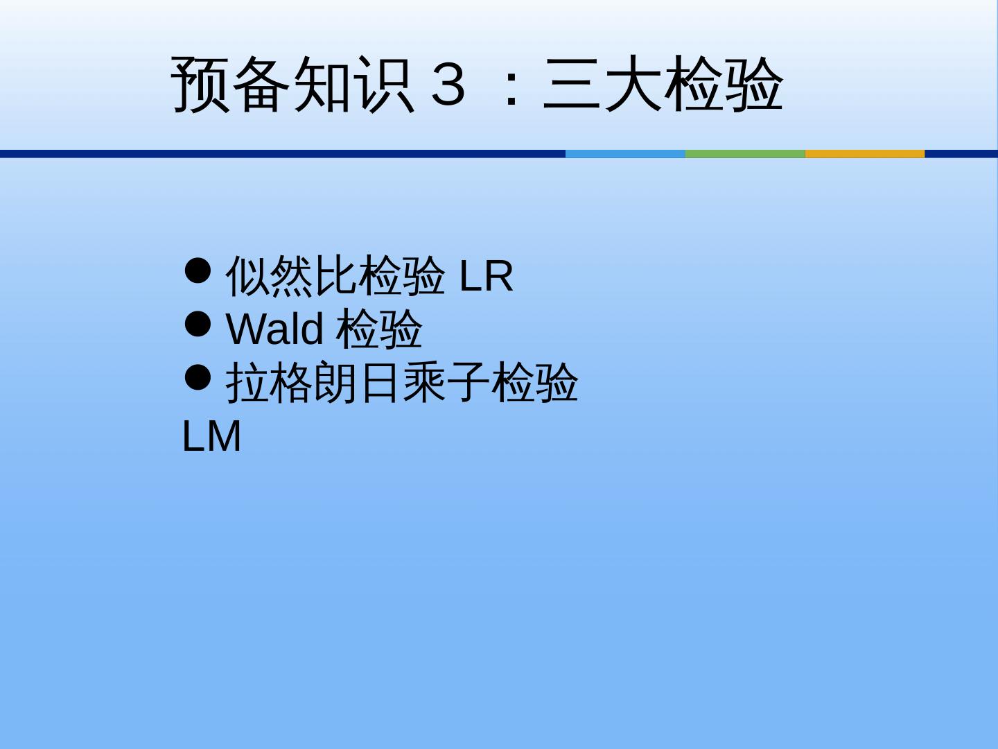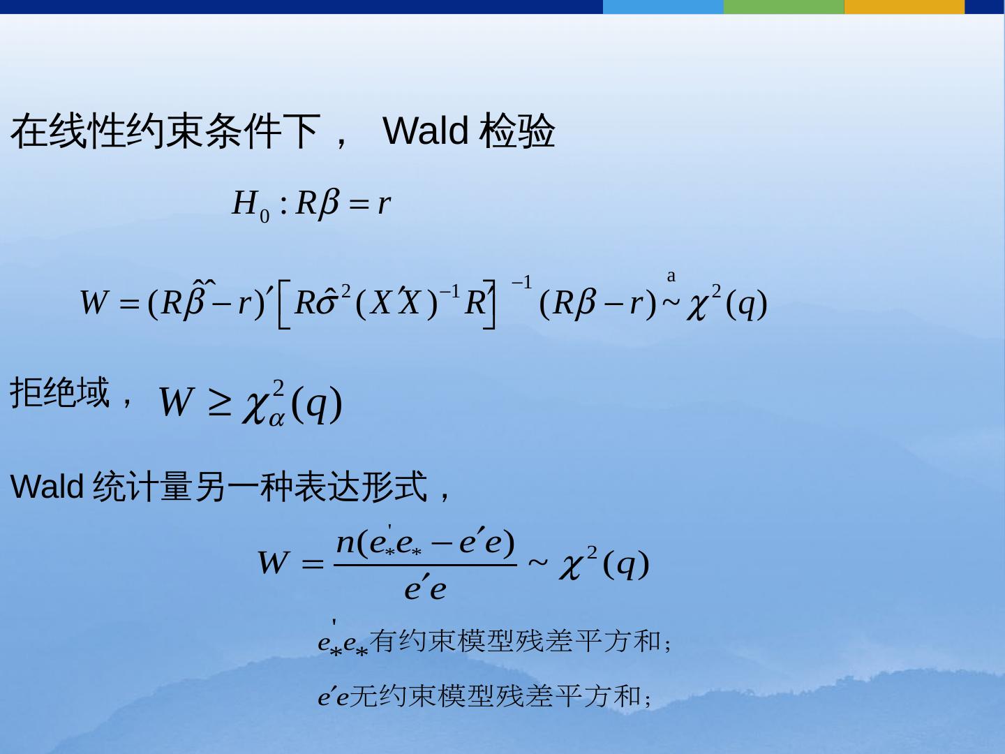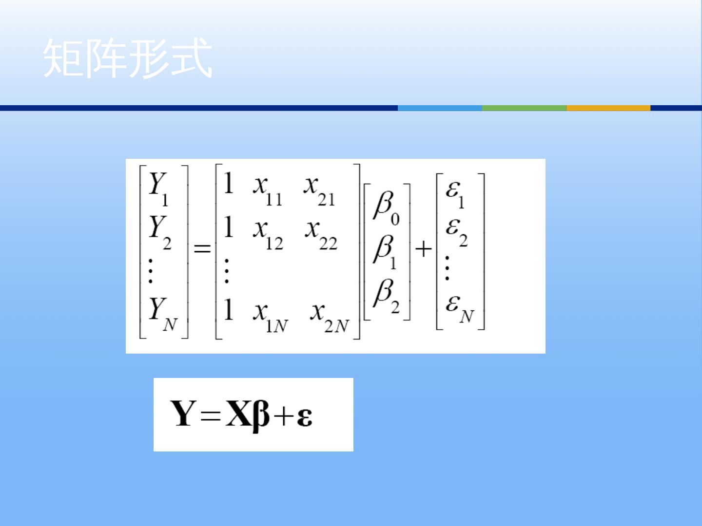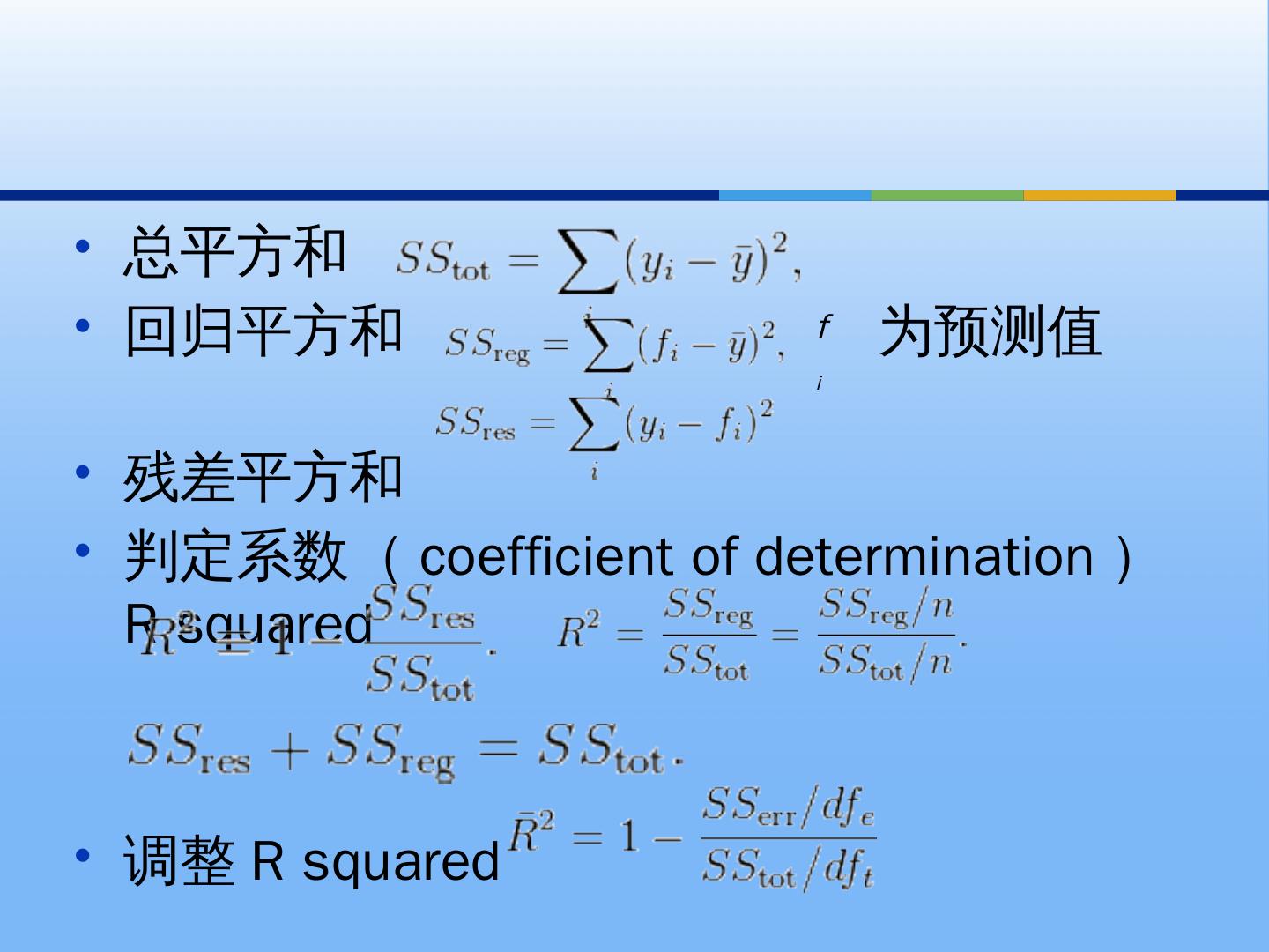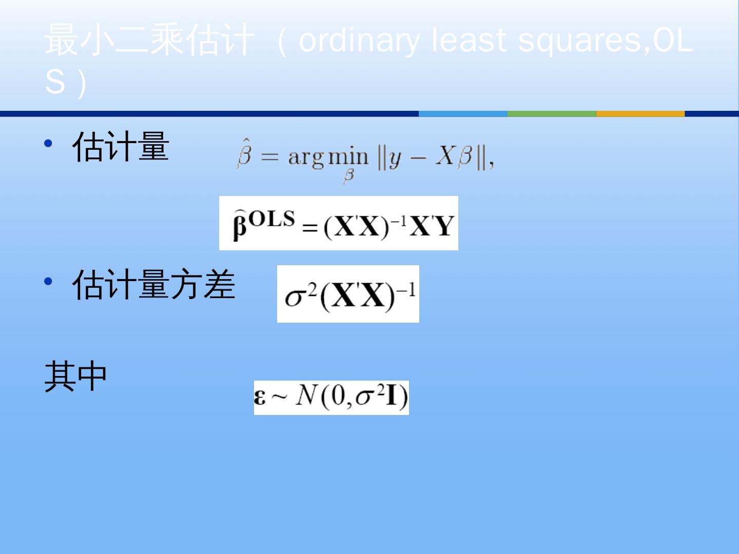 二元回归模型. 预备知识1:线性模型. 矩阵形式. 估计量. 估计量方差. 其中. 最小二乘估计(ordinary least squares,OLS). 总平方和; 回归平方和 为预测值; 残差平方和 ...