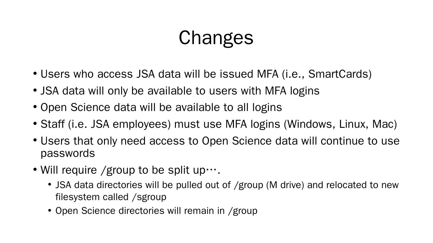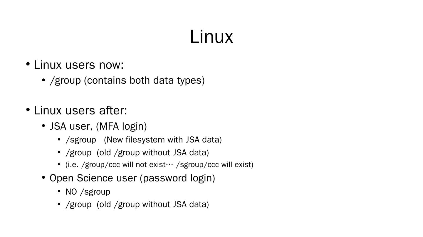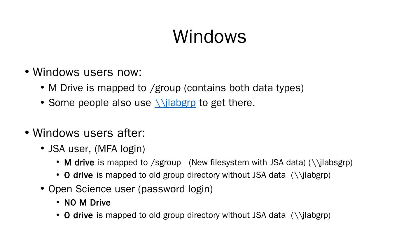 /Group and M drive are the same file system. Linux Desktop: /group/ccc; Windows Desktop: M:\ccc. Contains both Open Science data as well as JSA data (~300 ...