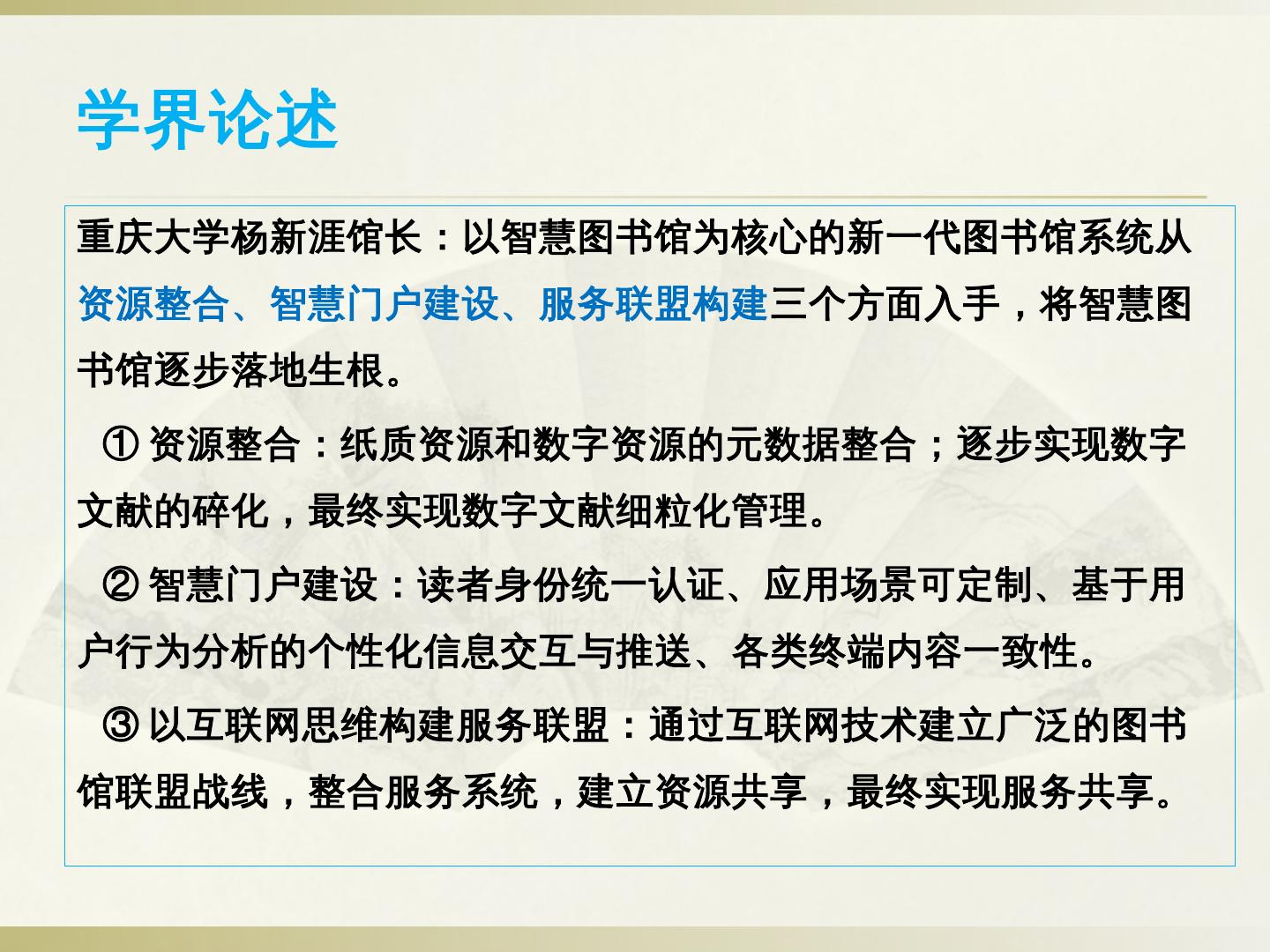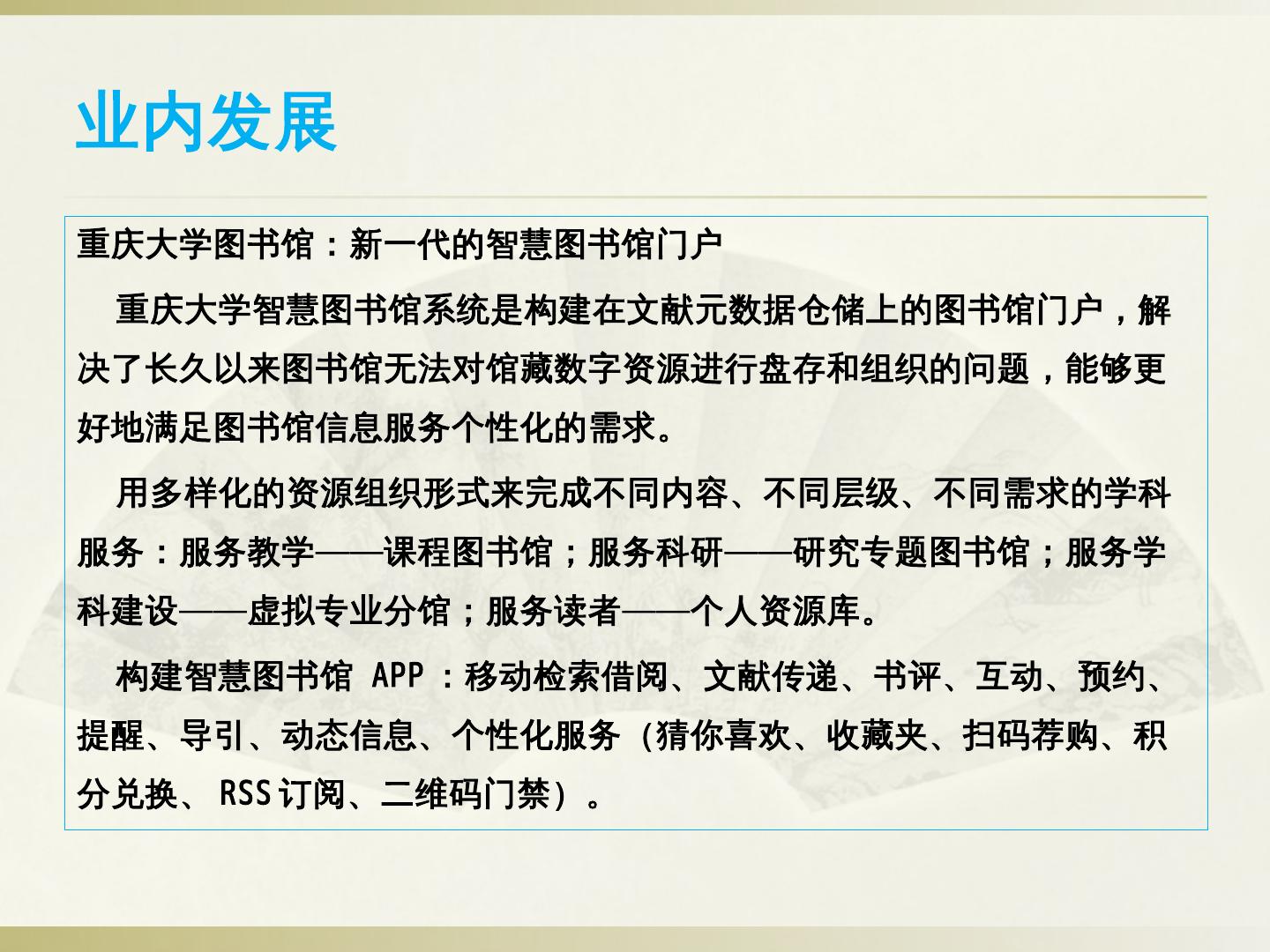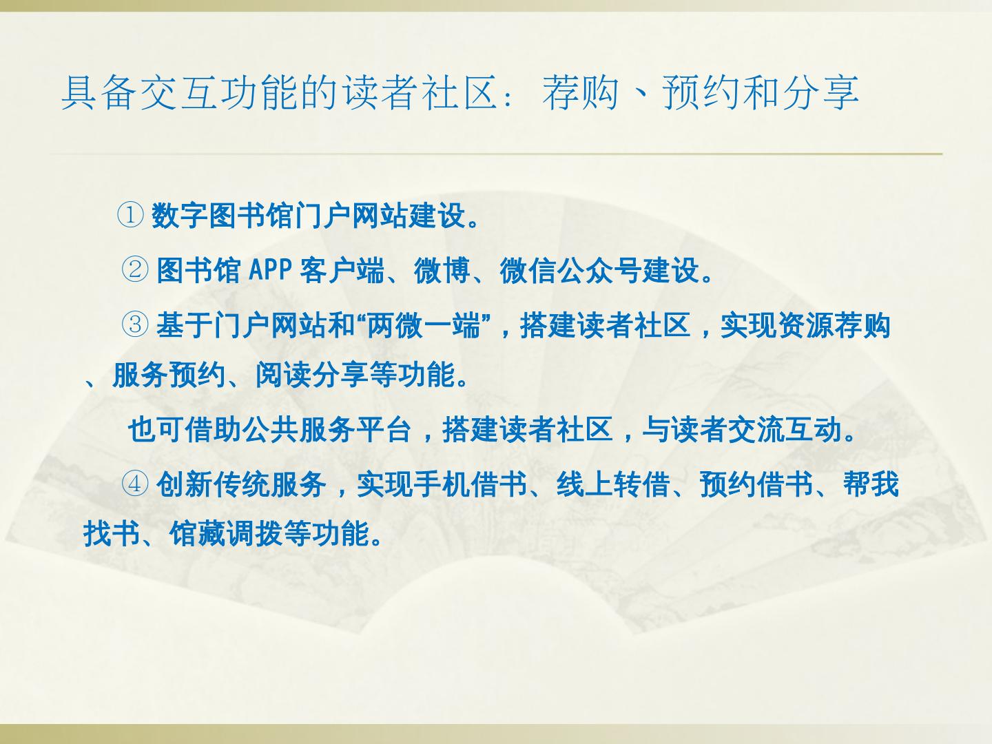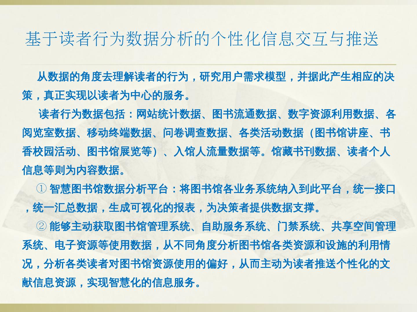 ②智慧门户建设:读者身份统一认证、应用场景可定制、基于用户行为分析的个性化信息交互与推送、各类终端内容一致性。 ③以互联网思维构建服务联盟:通过互联网 ...