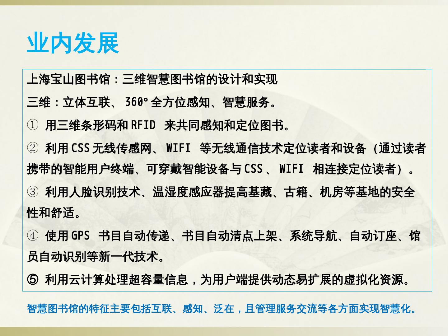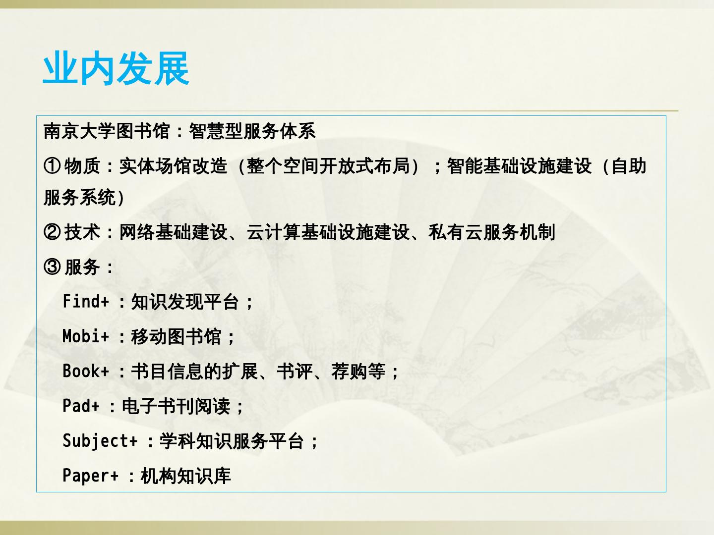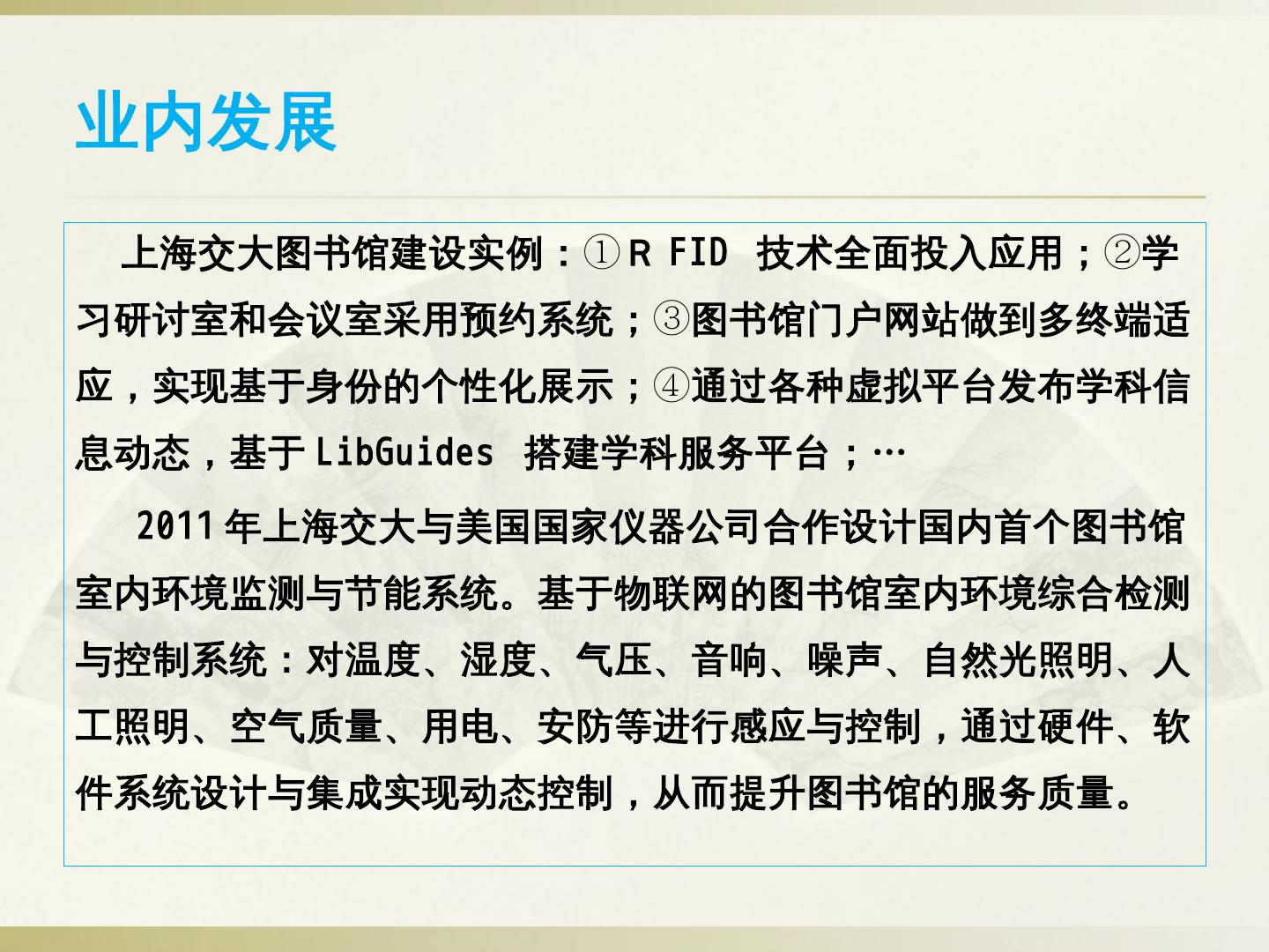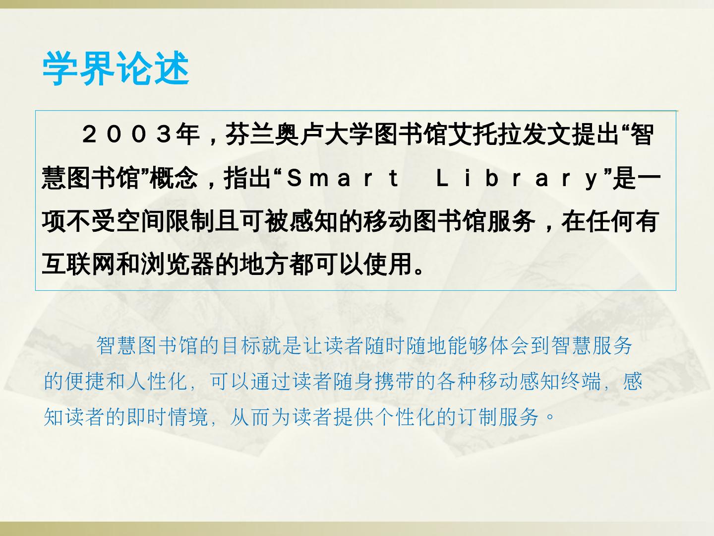 ②智慧门户建设:读者身份统一认证、应用场景可定制、基于用户行为分析的个性化信息交互与推送、各类终端内容一致性。 ③以互联网思维构建服务联盟:通过互联网 ...