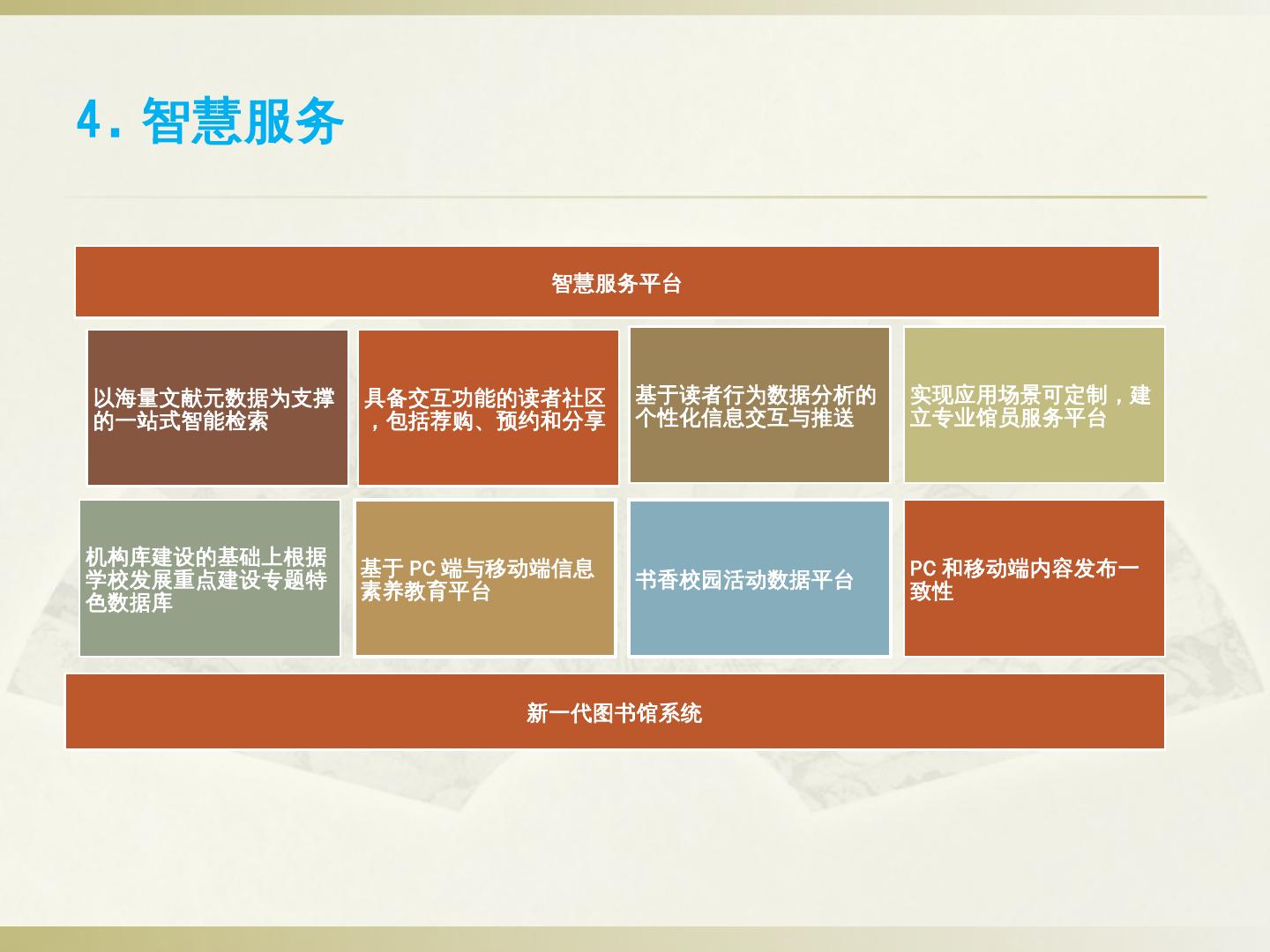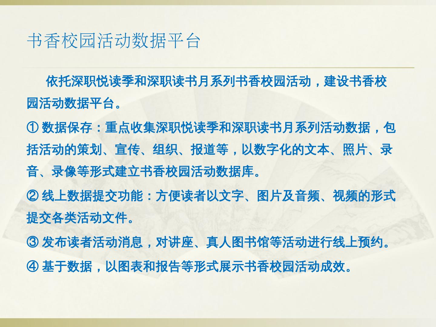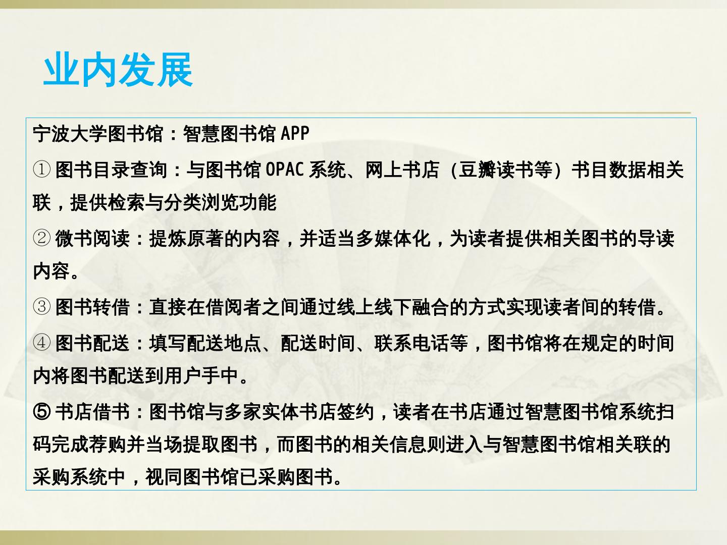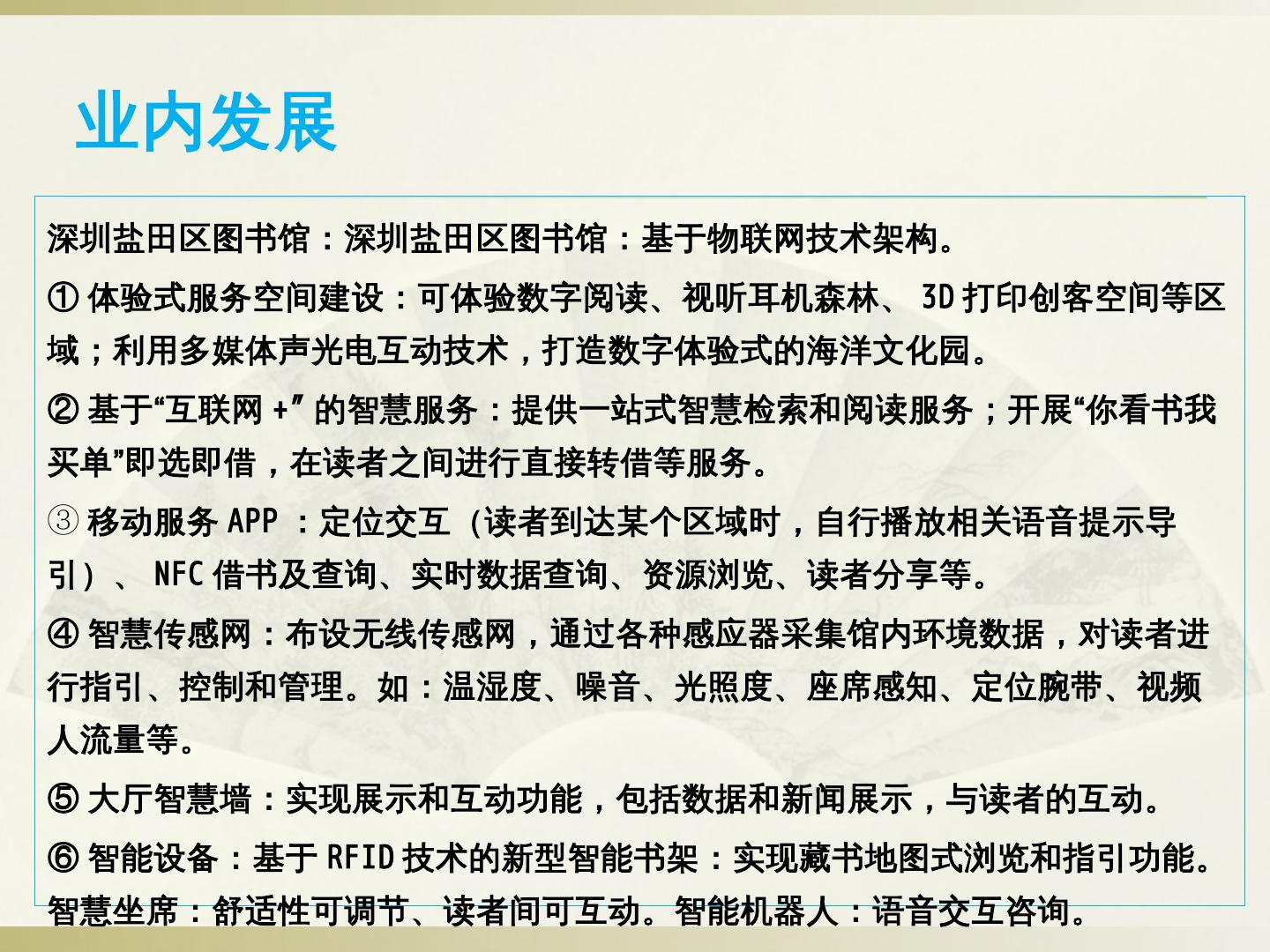 ②智慧门户建设:读者身份统一认证、应用场景可定制、基于用户行为分析的个性化信息交互与推送、各类终端内容一致性。 ③以互联网思维构建服务联盟:通过互联网 ...