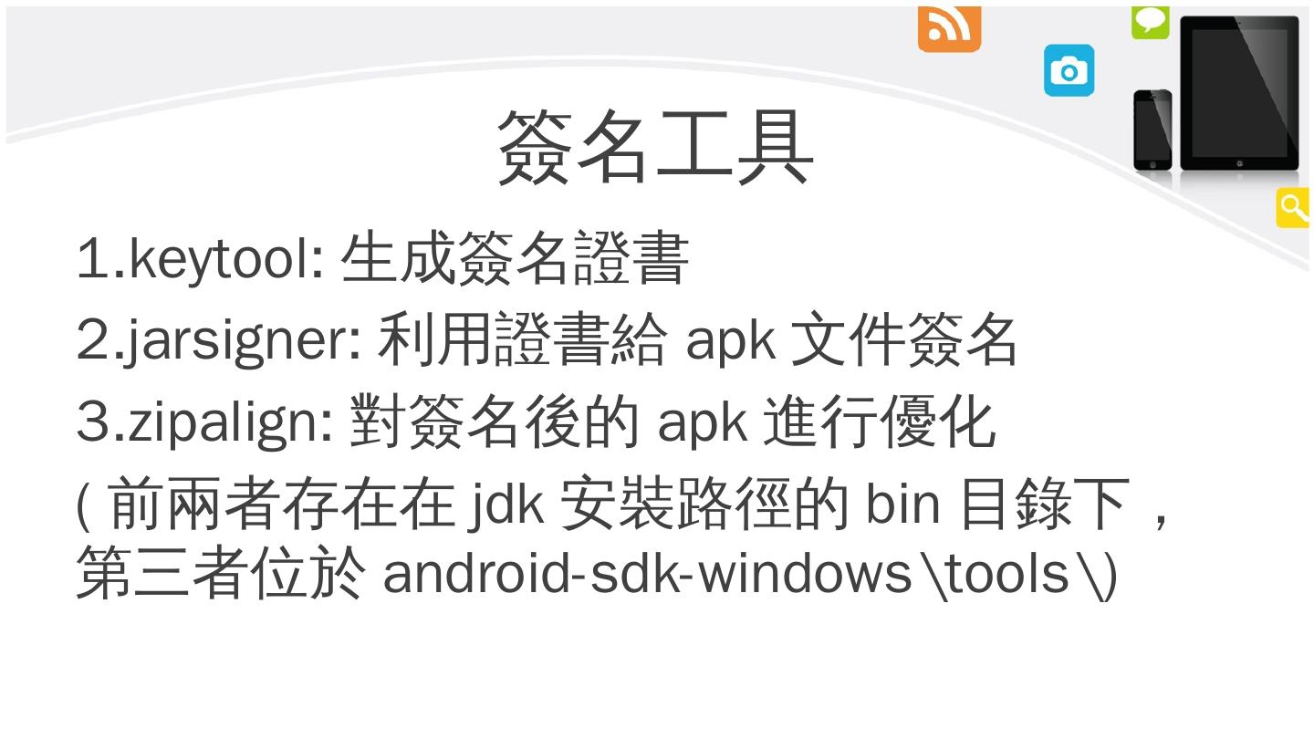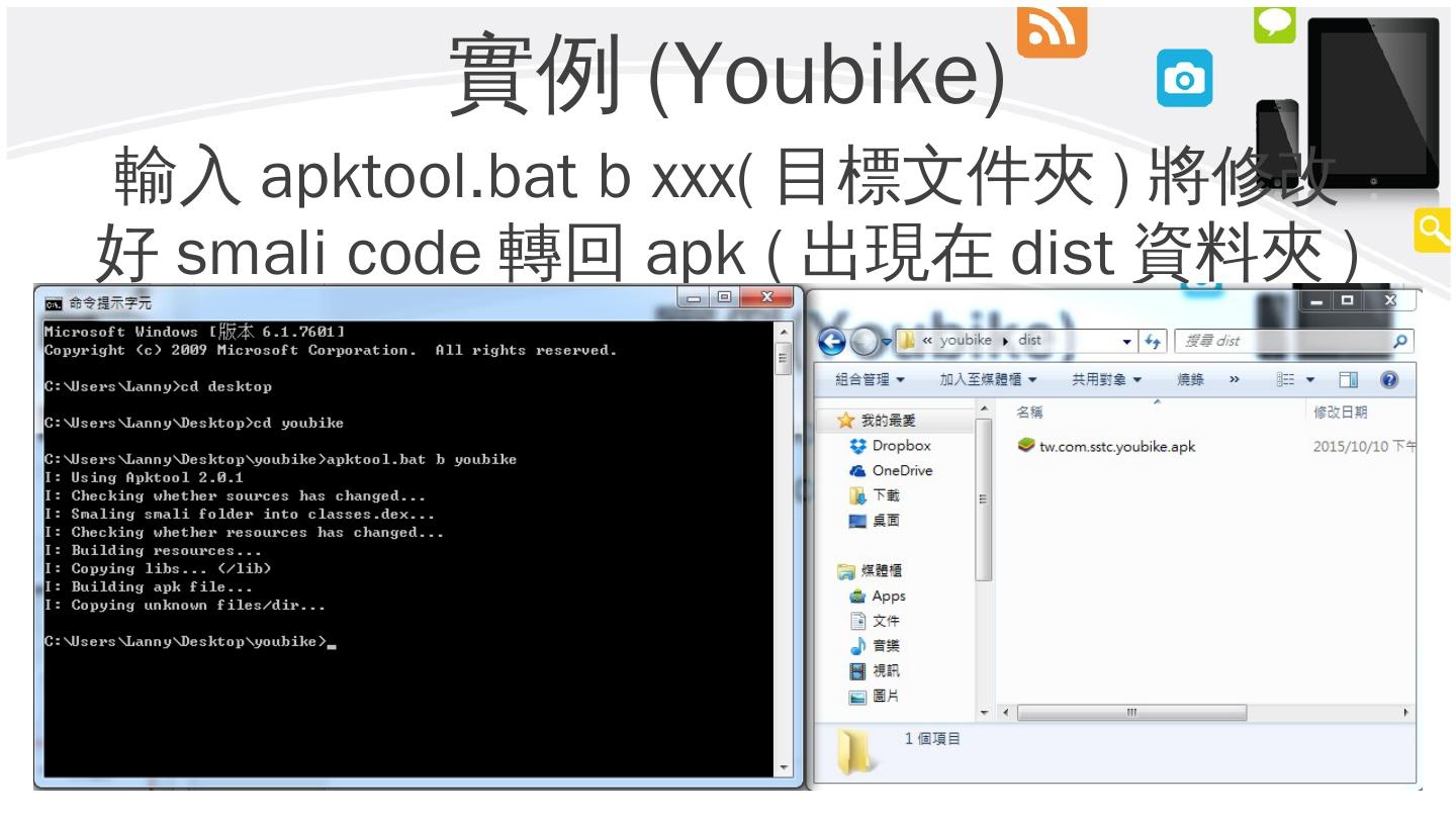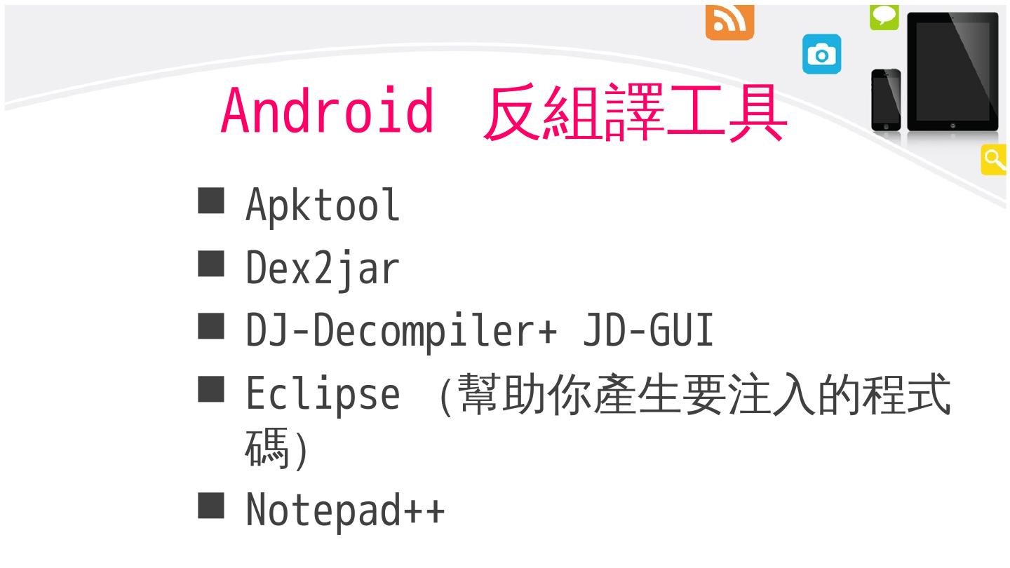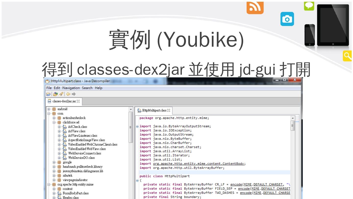 Android 反編譯步驟. 1.使用apktool將app轉成smali code(難看). 2.將app轉成zip檔,將其中classes.dex取出. 3.使用dex2jar,將classes.dex轉成jar檔. 4.使用JD-GUI ...