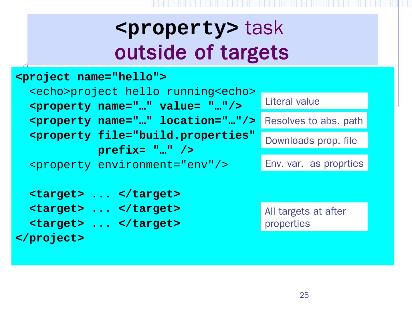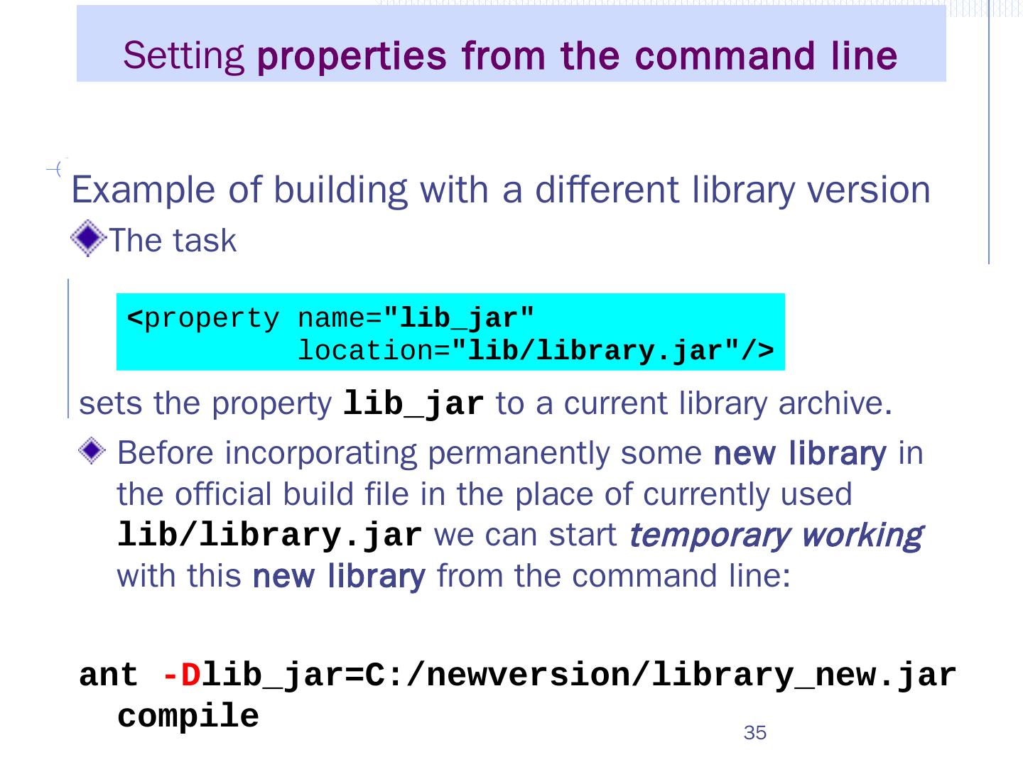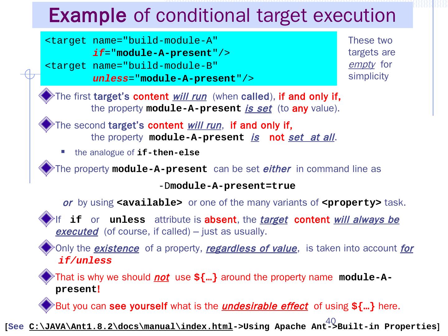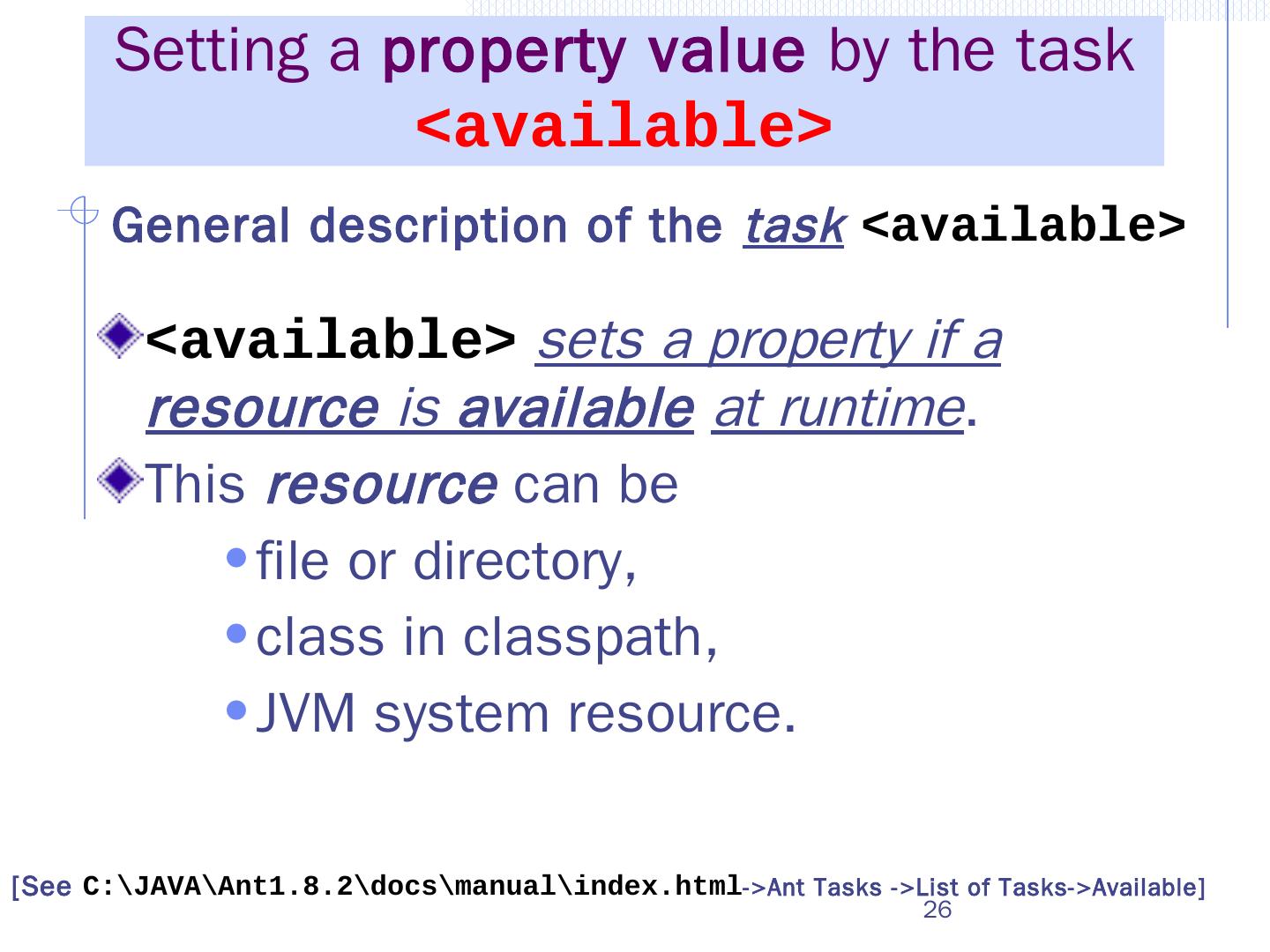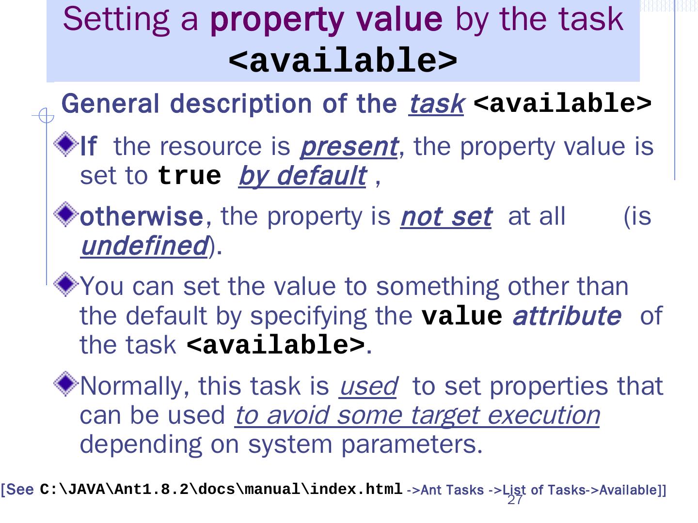 These slides are mainly based on “Java Development with Ant” - E. Hatcher ... [echo] ant.version = Apache Ant(TM) version 1.8.2 compiled on December 20 ...