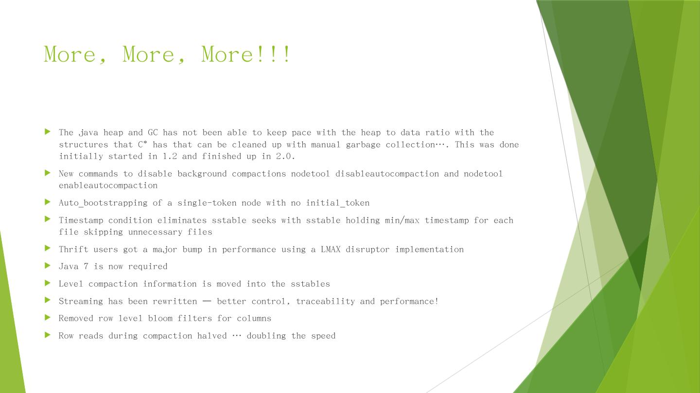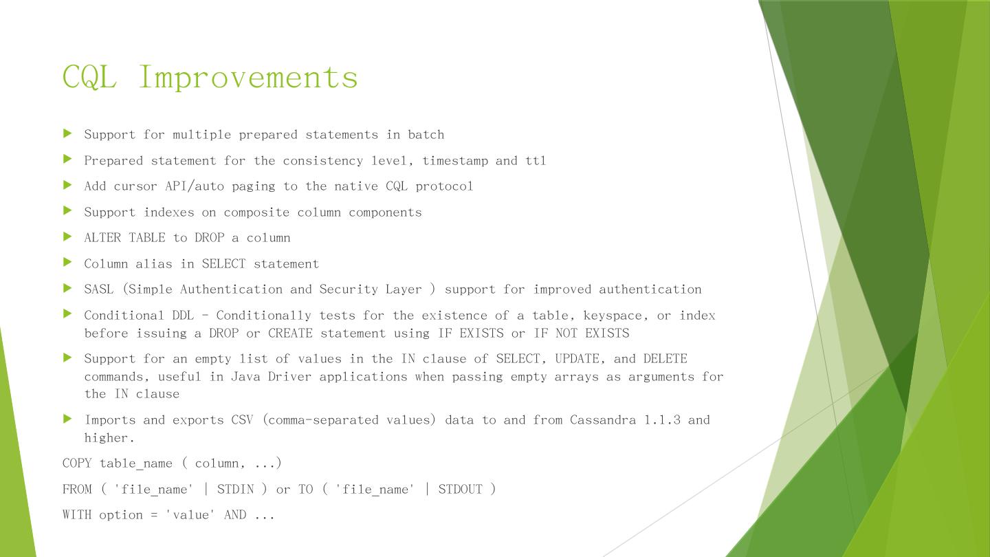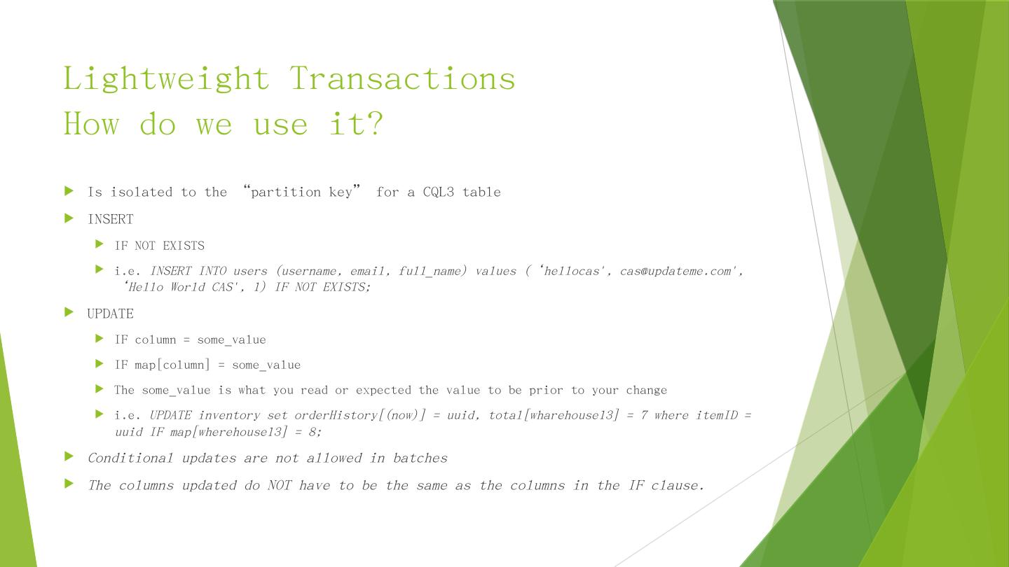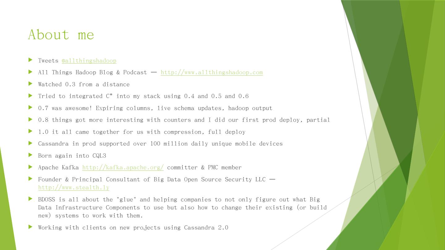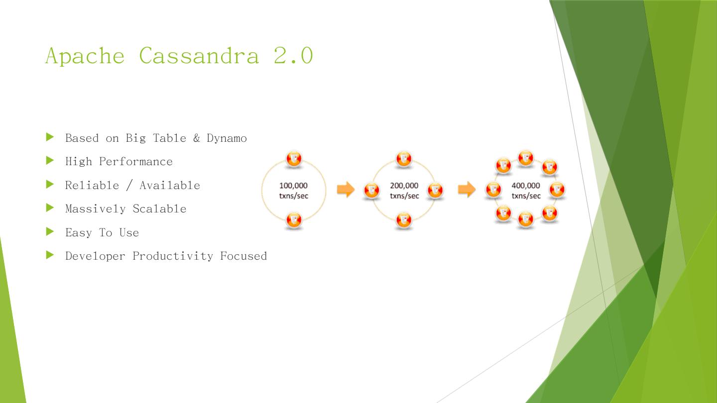 Working with clients on new projects using Cassandra 2.0. Apache Cassandra 2.0. Based on Big Table & Dynamo; High Performance; Reliable / Available ...