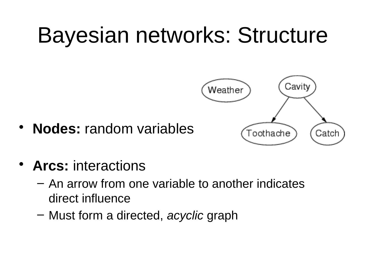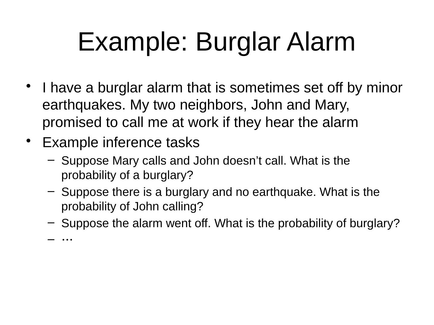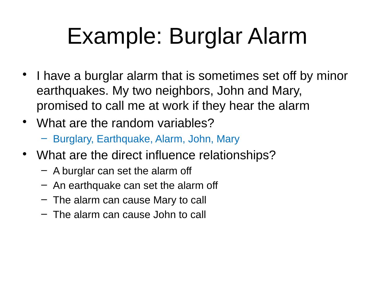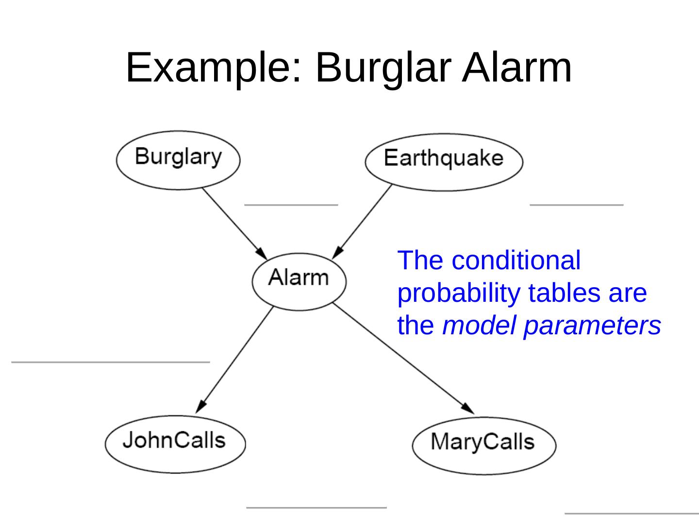 Example: Naïve Bayes document model. Random variables: X: document class; W1, …, Wn: words in the document. W1. W2. Wn … X. Example: Burglar Alarm.