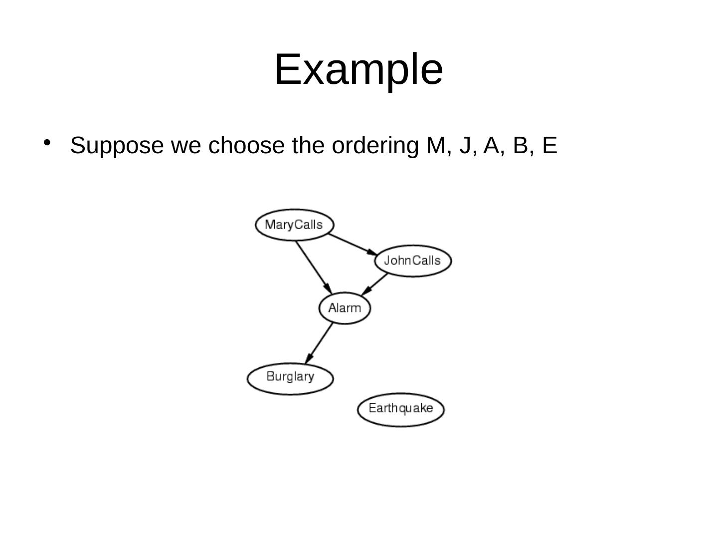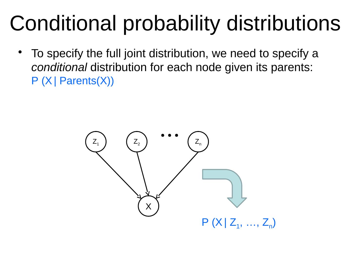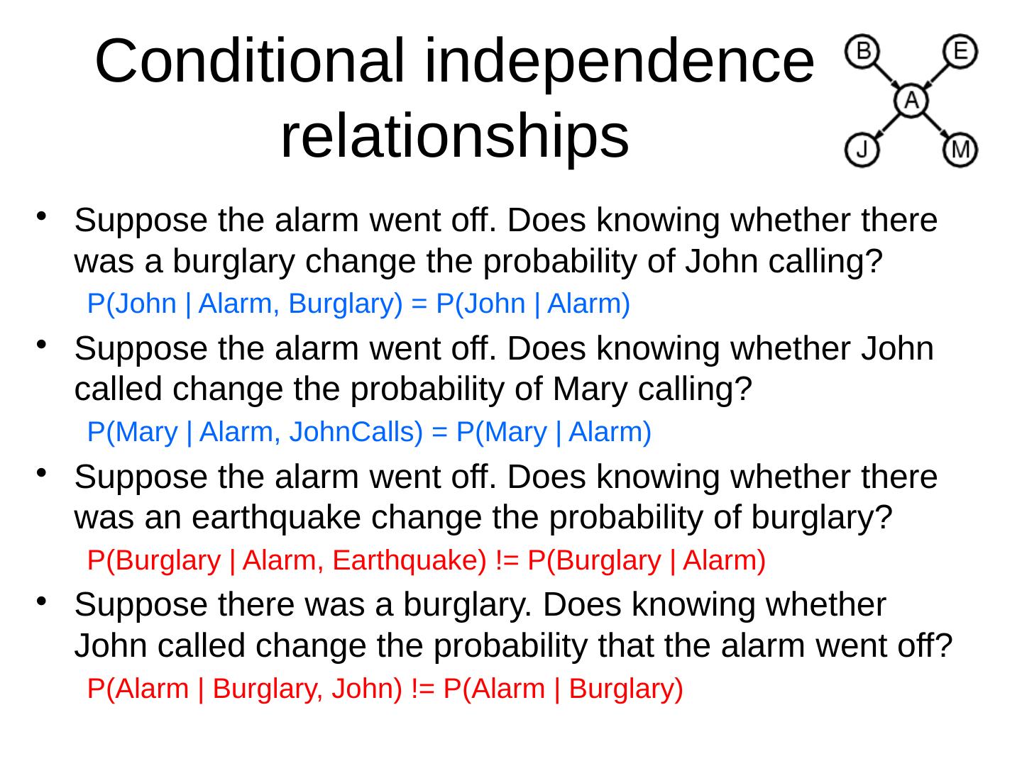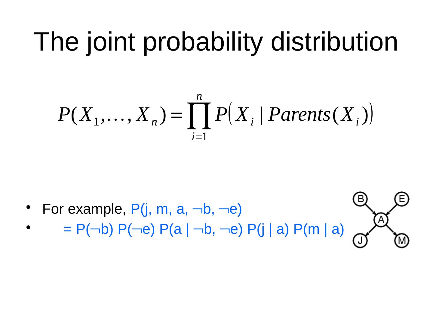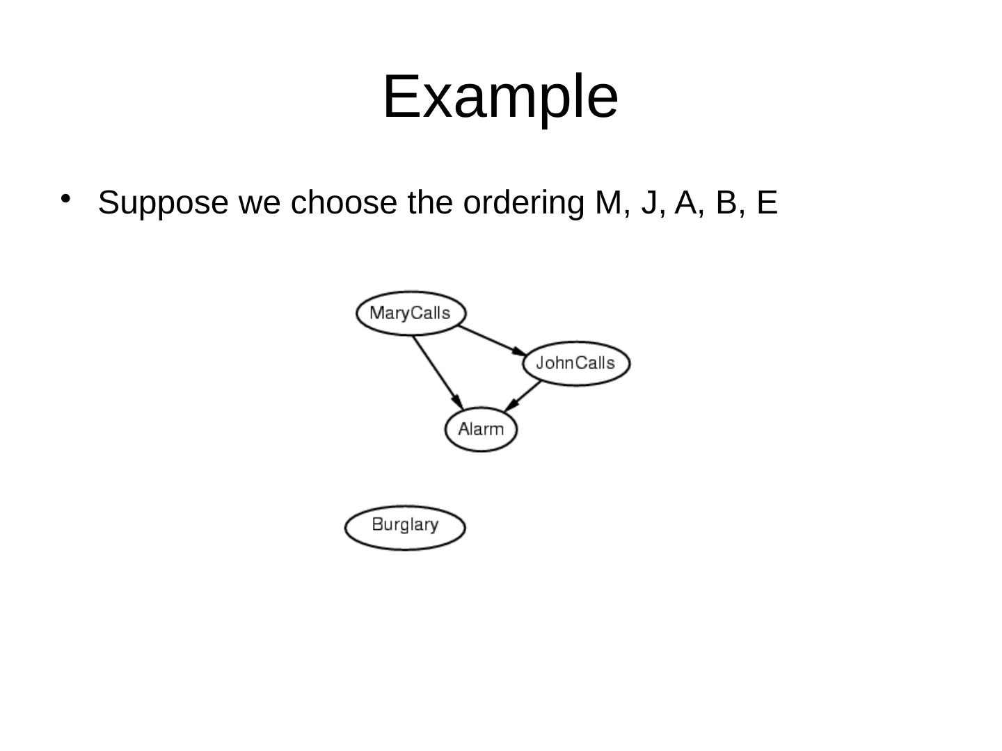 Example: Naïve Bayes document model. Random variables: X: document class; W1, …, Wn: words in the document. W1. W2. Wn … X. Example: Burglar Alarm.