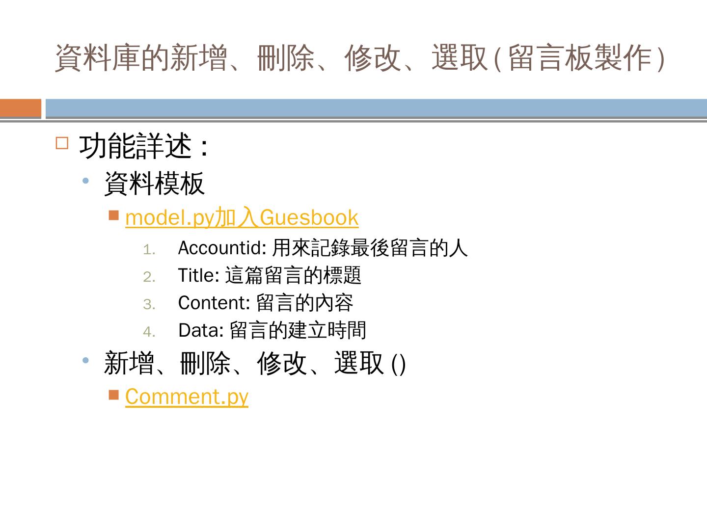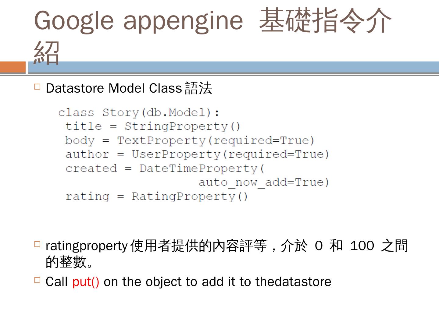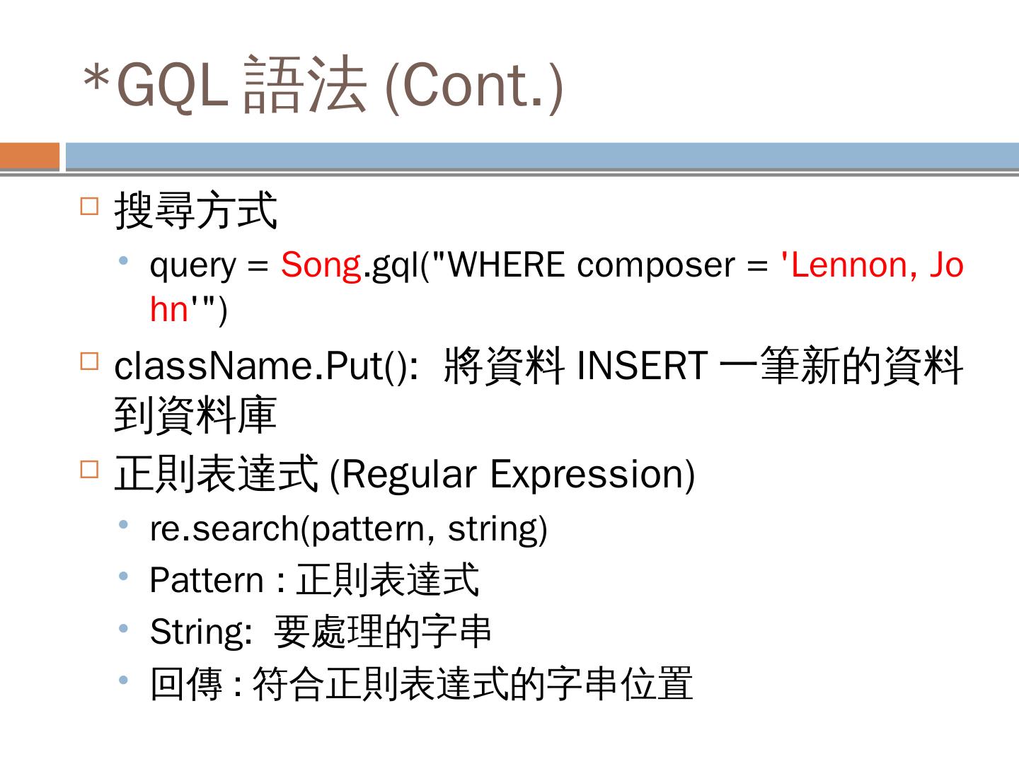 Google File System(GFS):為google自行開發的分散式文件系統,多欄位的設計,不 .... Put(): 將資料INSERT一筆新的資料到資料庫; 正則表達式(Regular Expression).