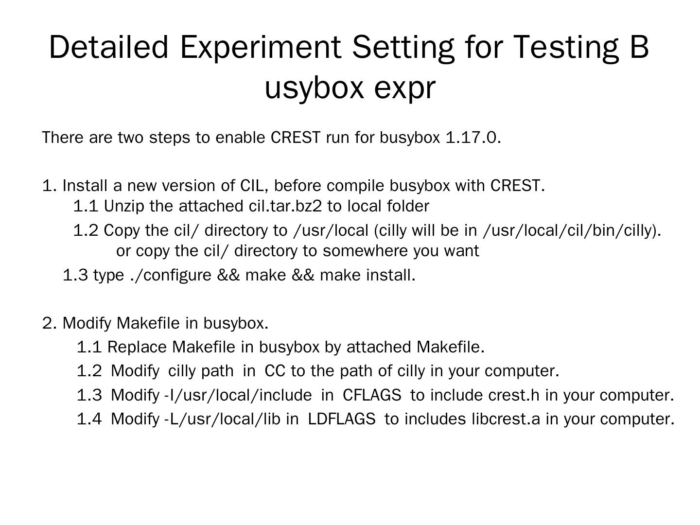 Use Makefile and cil package we distribute to compile busybox expr with CREST. Also, use Busybox 1.17.0. For busybox expr, generate 10,000 ...