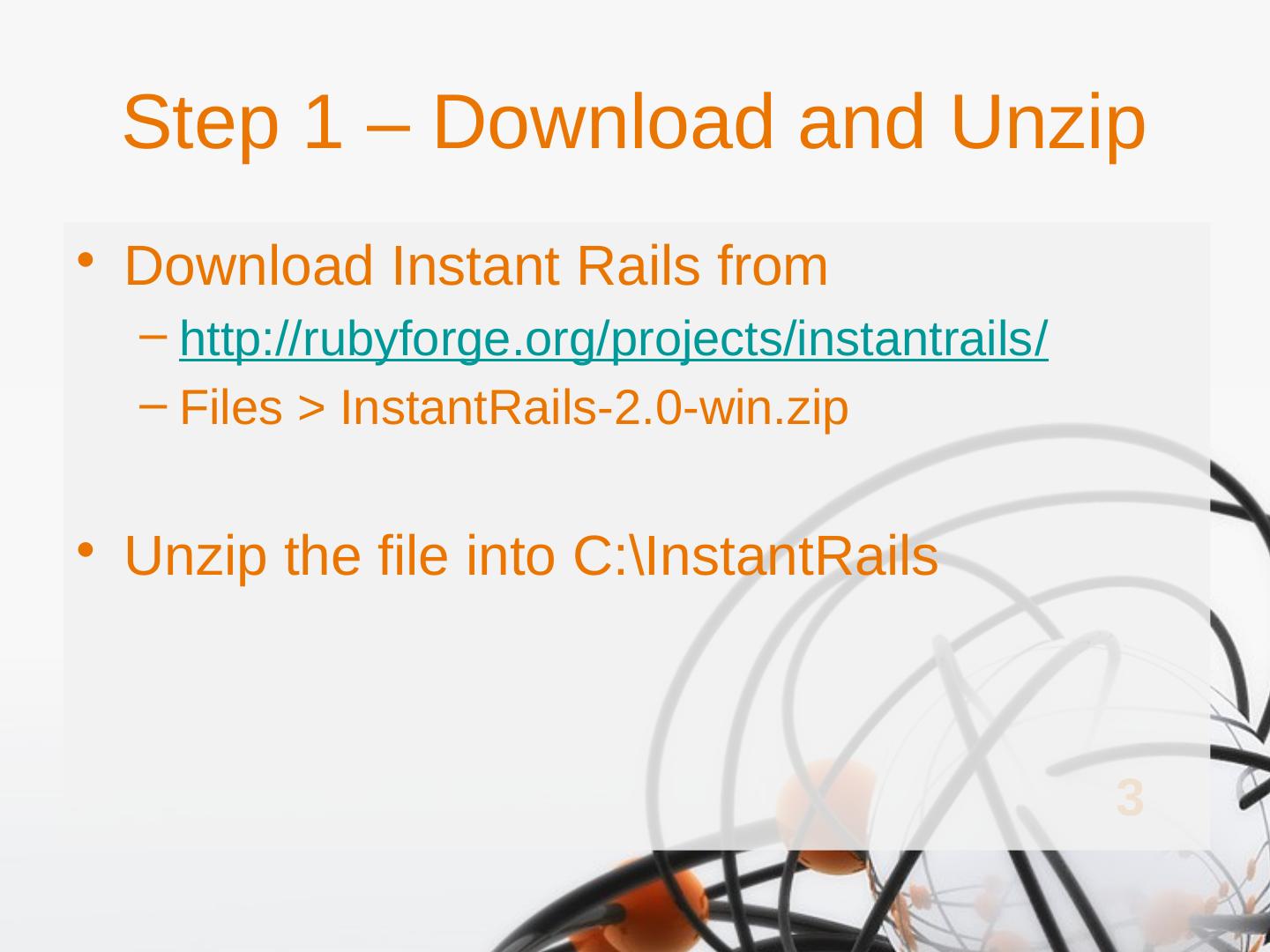 3 . Step 1 – Download and Unzip • Download Instant Rails from – http://rubyforge.org/projects/instantrails/ – Files > InstantRails-2.0-win.zip • Unzip the file into C:\InstantRails 3