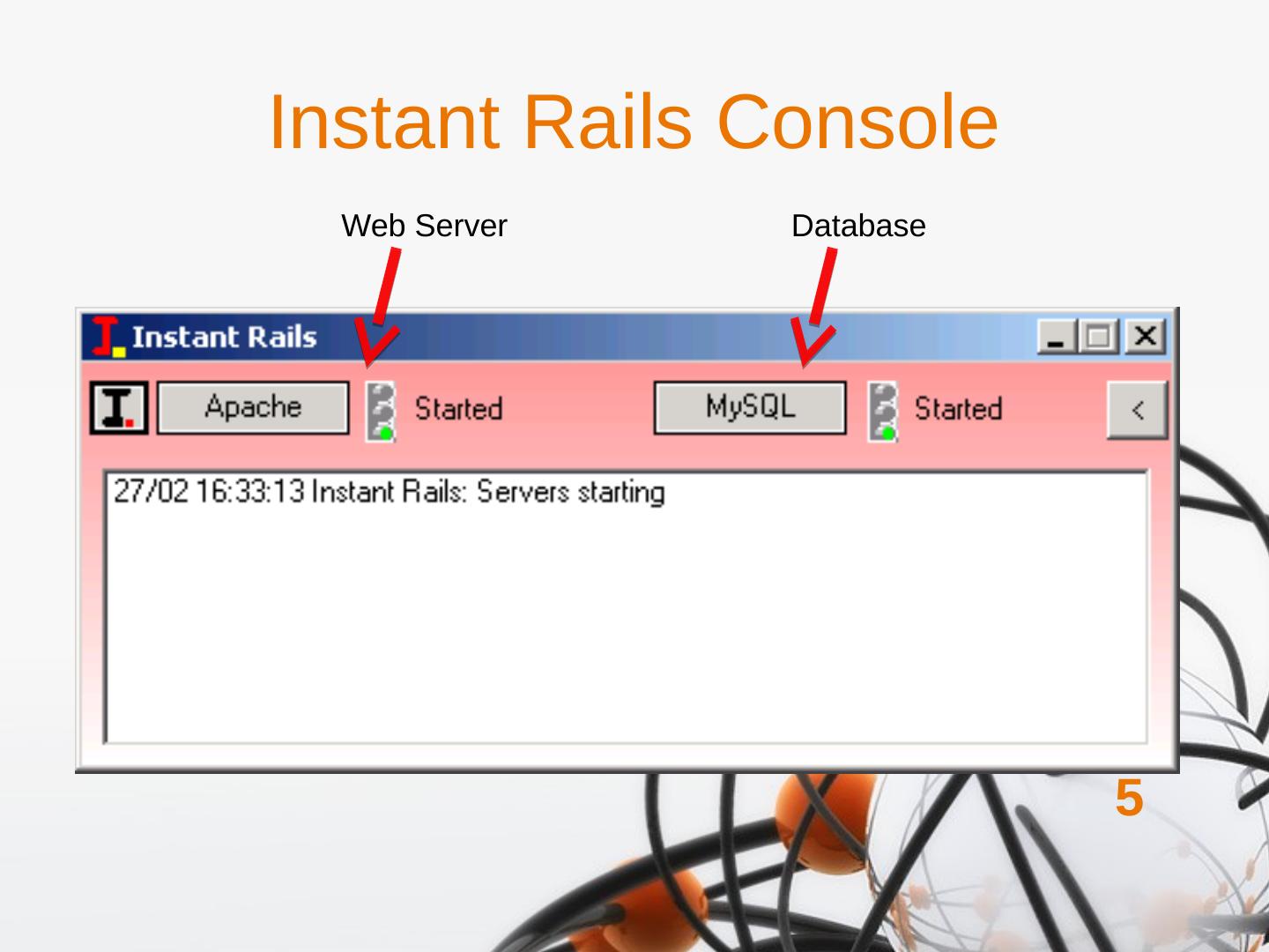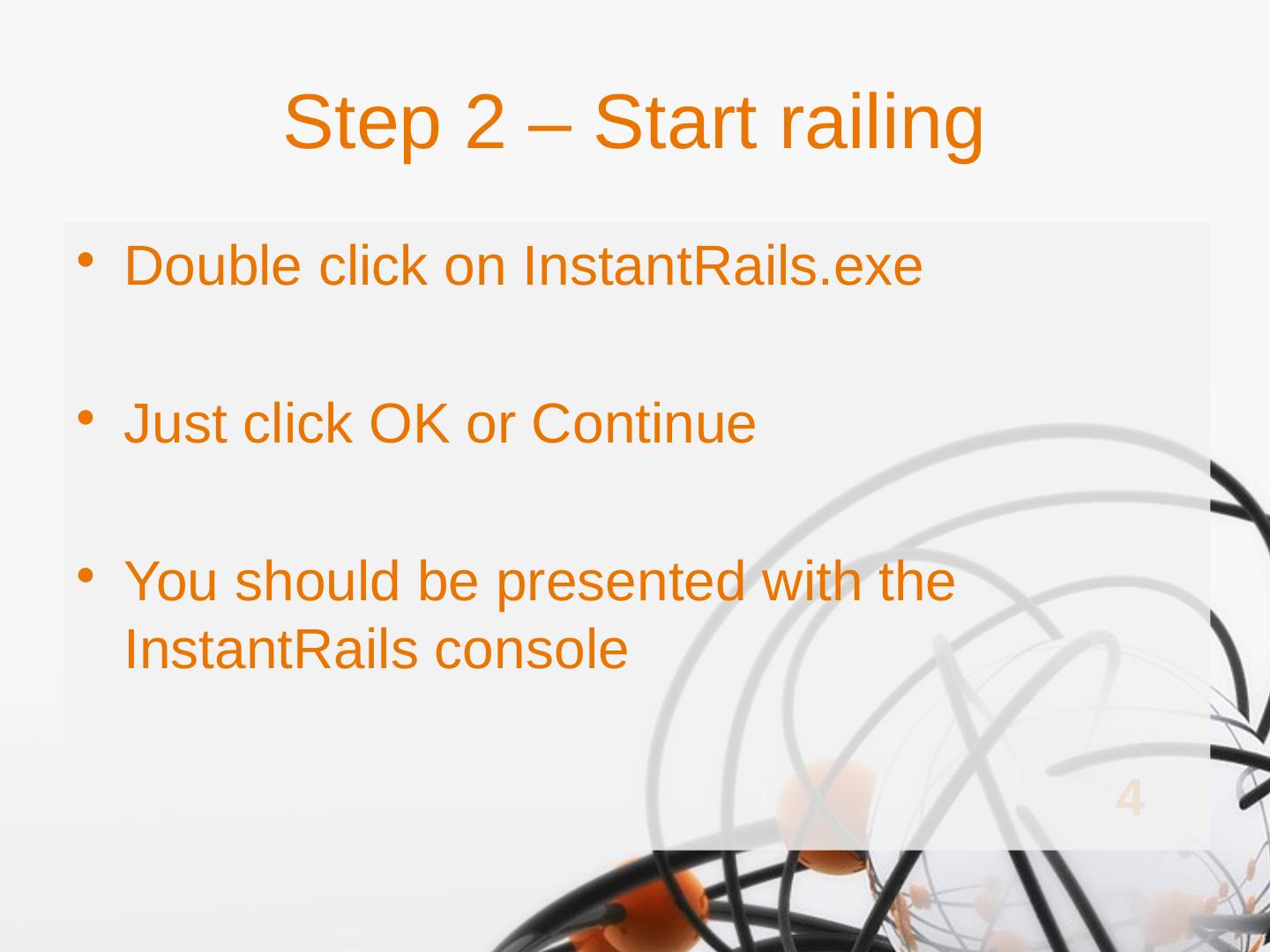 4 . Step 2 – Start railing • Double click on InstantRails.exe • Just click OK or Continue • You should be presented with the InstantRails console 4