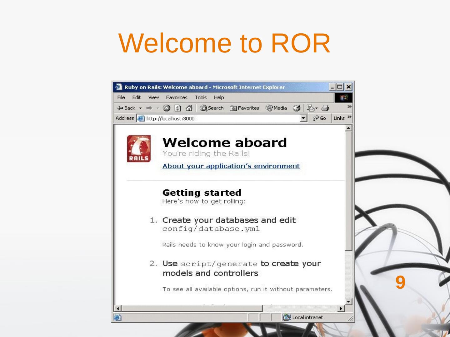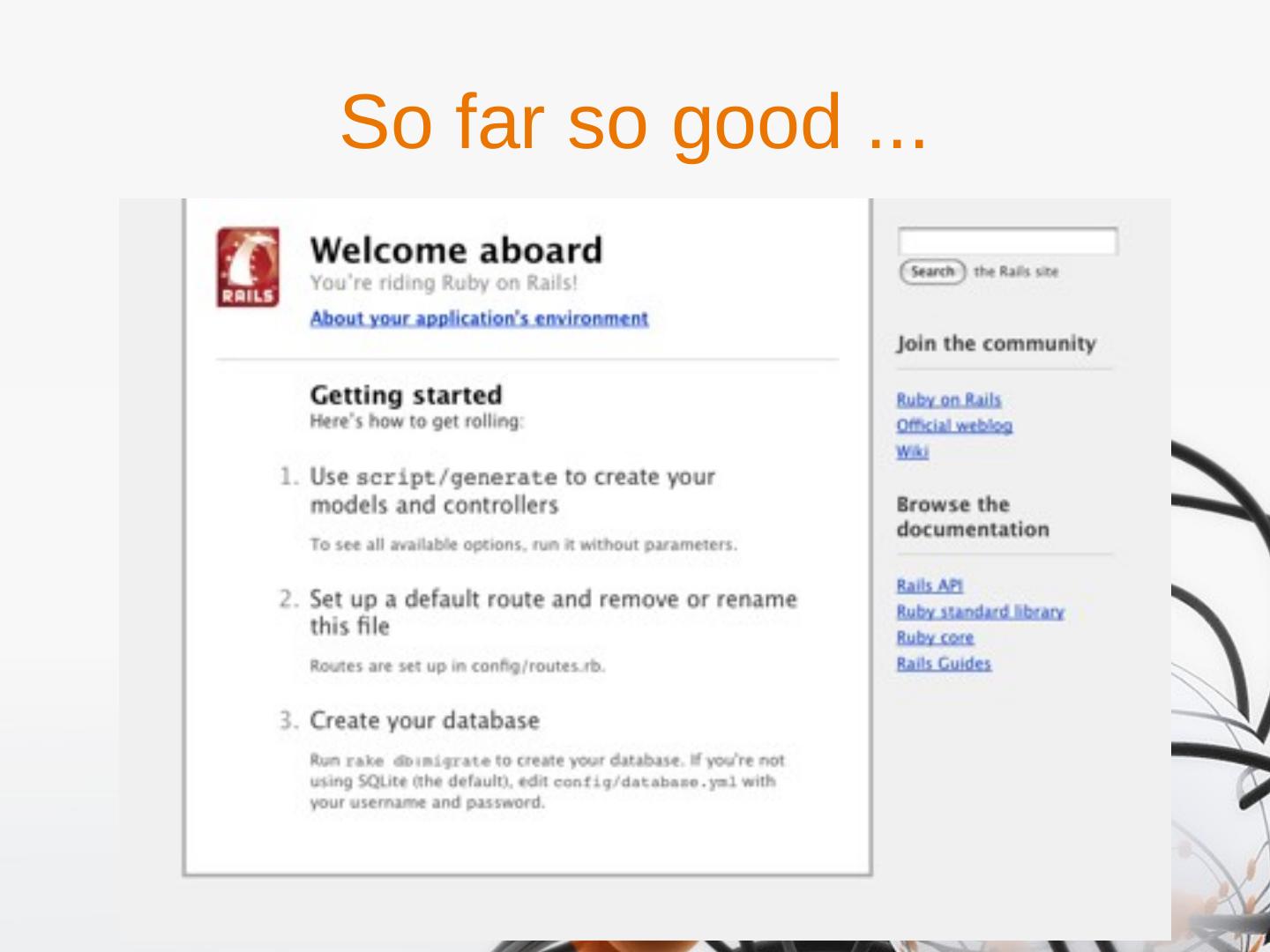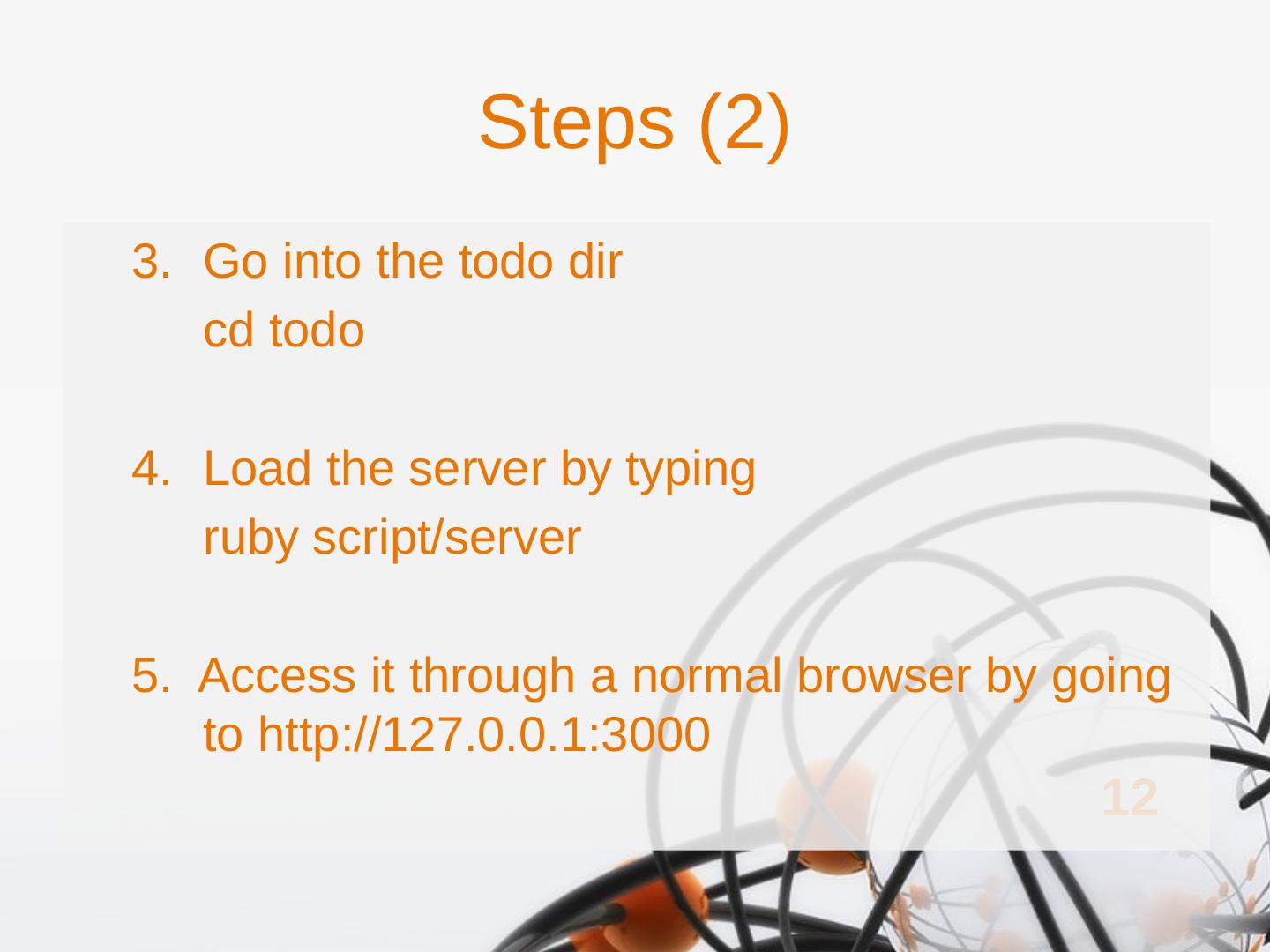 12 . Steps (2) 3. Go into the todo dir cd todo 4. Load the server by typing ruby script/server 5. Access it through a normal browser by going to http://127.0.0.1:3000 12