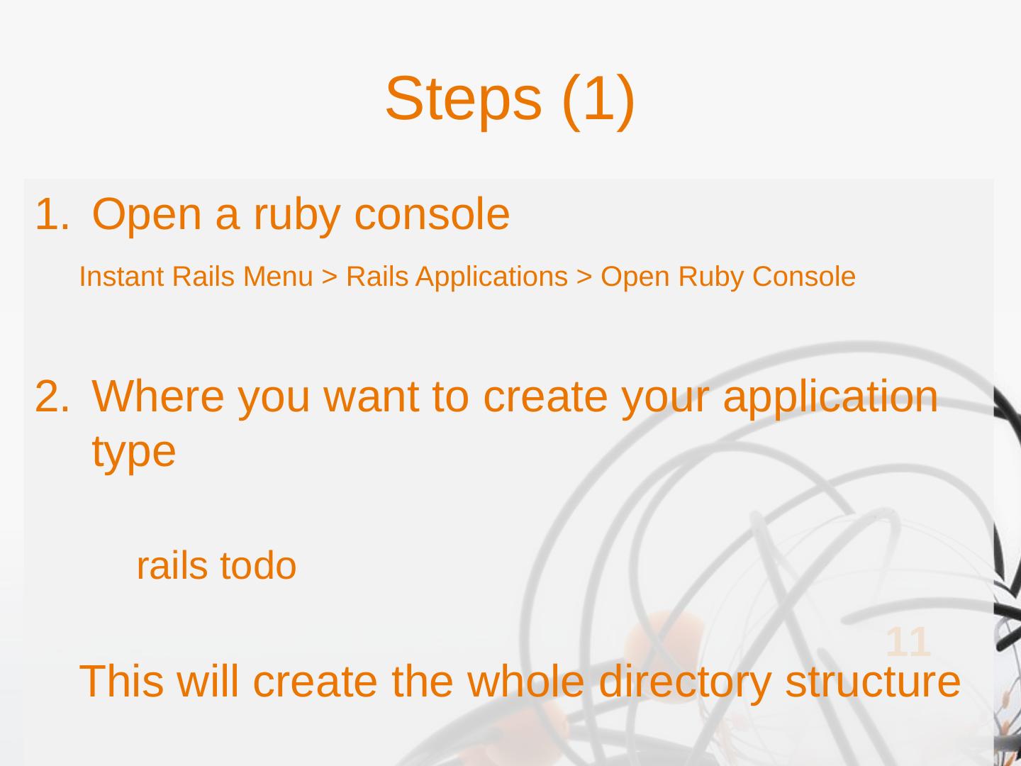11 . Steps (1) 1. Open a ruby console Instant Rails Menu > Rails Applications > Open Ruby Console 2. Where you want to create your application type rails todo 11 This will create the whole directory structure