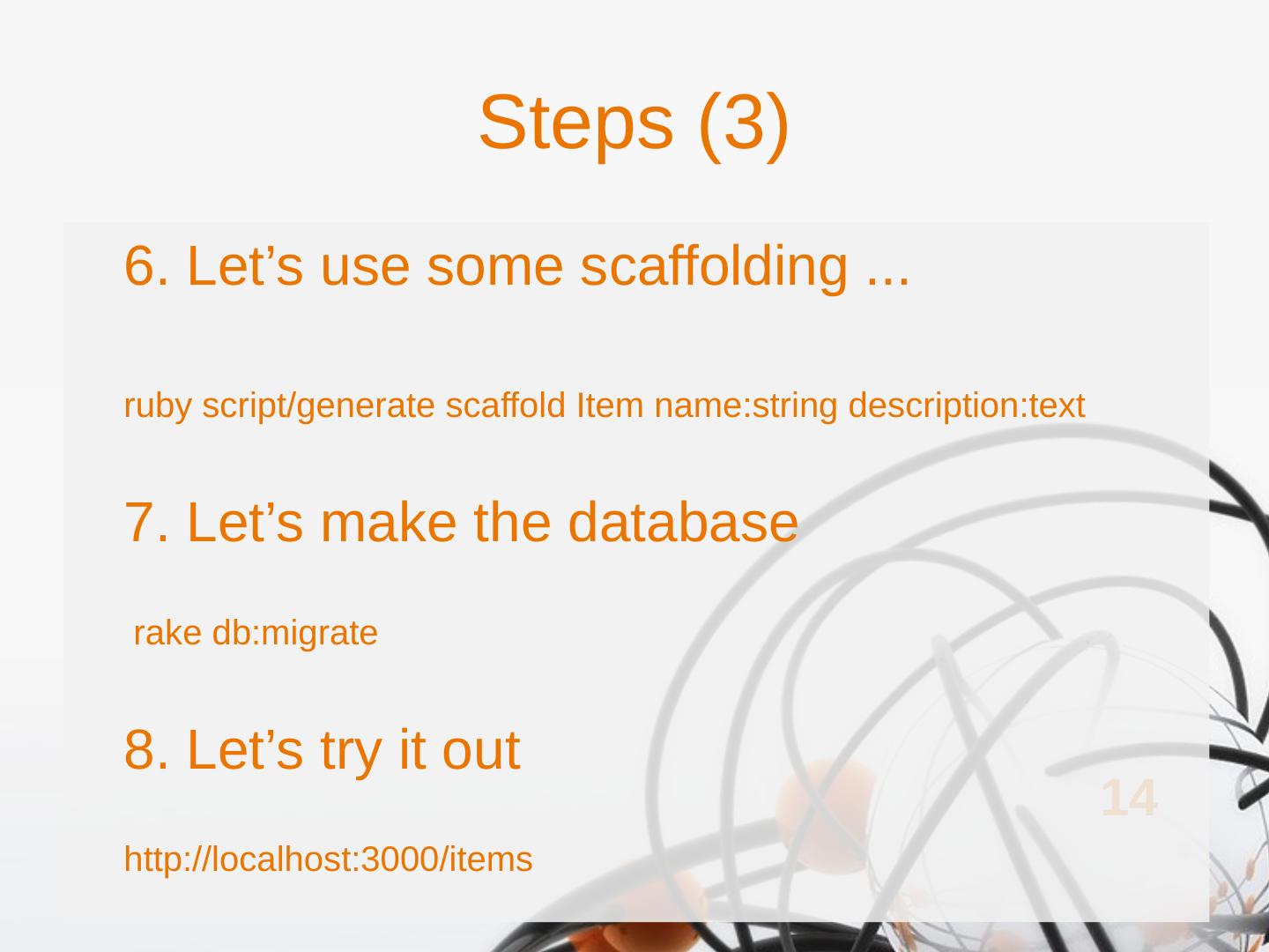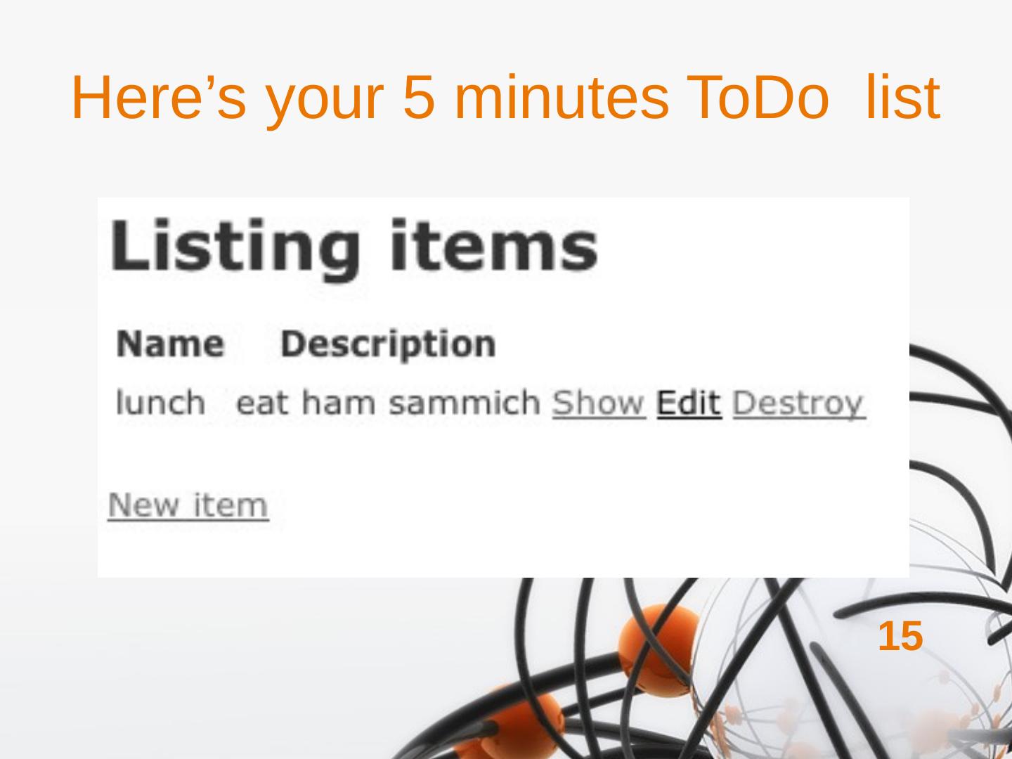 14 . Steps (3) 6. Let’s use some scaffolding ... ruby script/generate scaffold Item name:string description:text 7. Let’s make the database rake db:migrate 8. Let’s try it out 14 http://localhost:3000/items