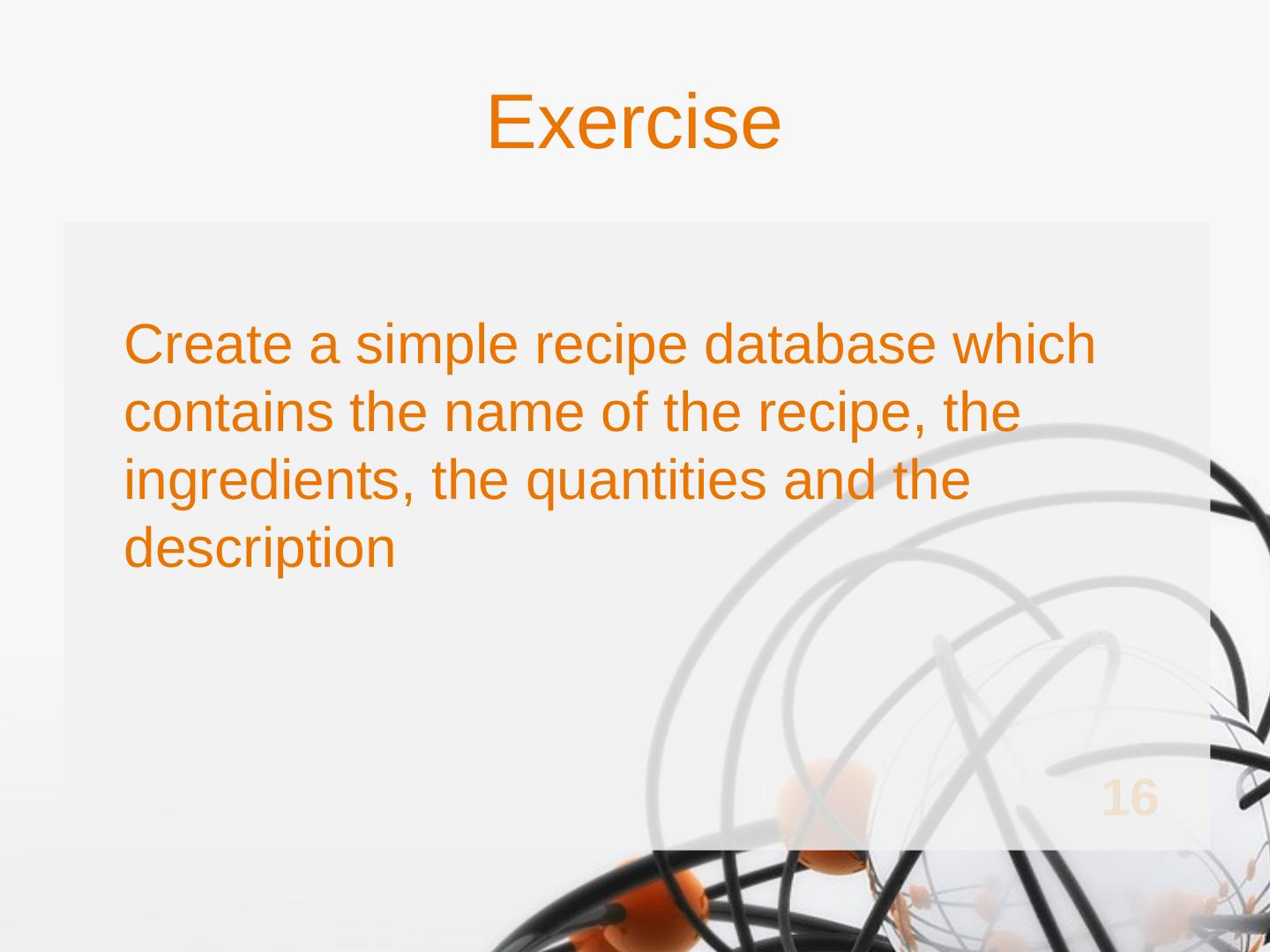 16 . Exercise Create a simple recipe database which contains the name of the recipe, the ingredients, the quantities and the description 16