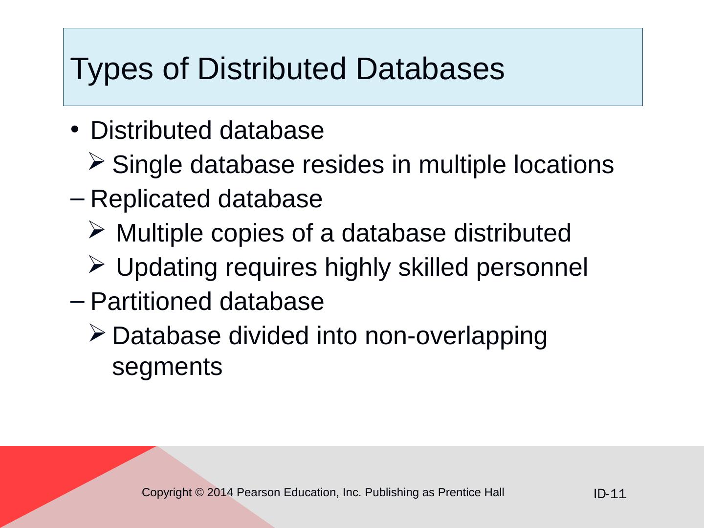 Types of Distributed Databases. Distributed database. Single database resides in multiple locations. Replicated database. Multiple copies of a database ...