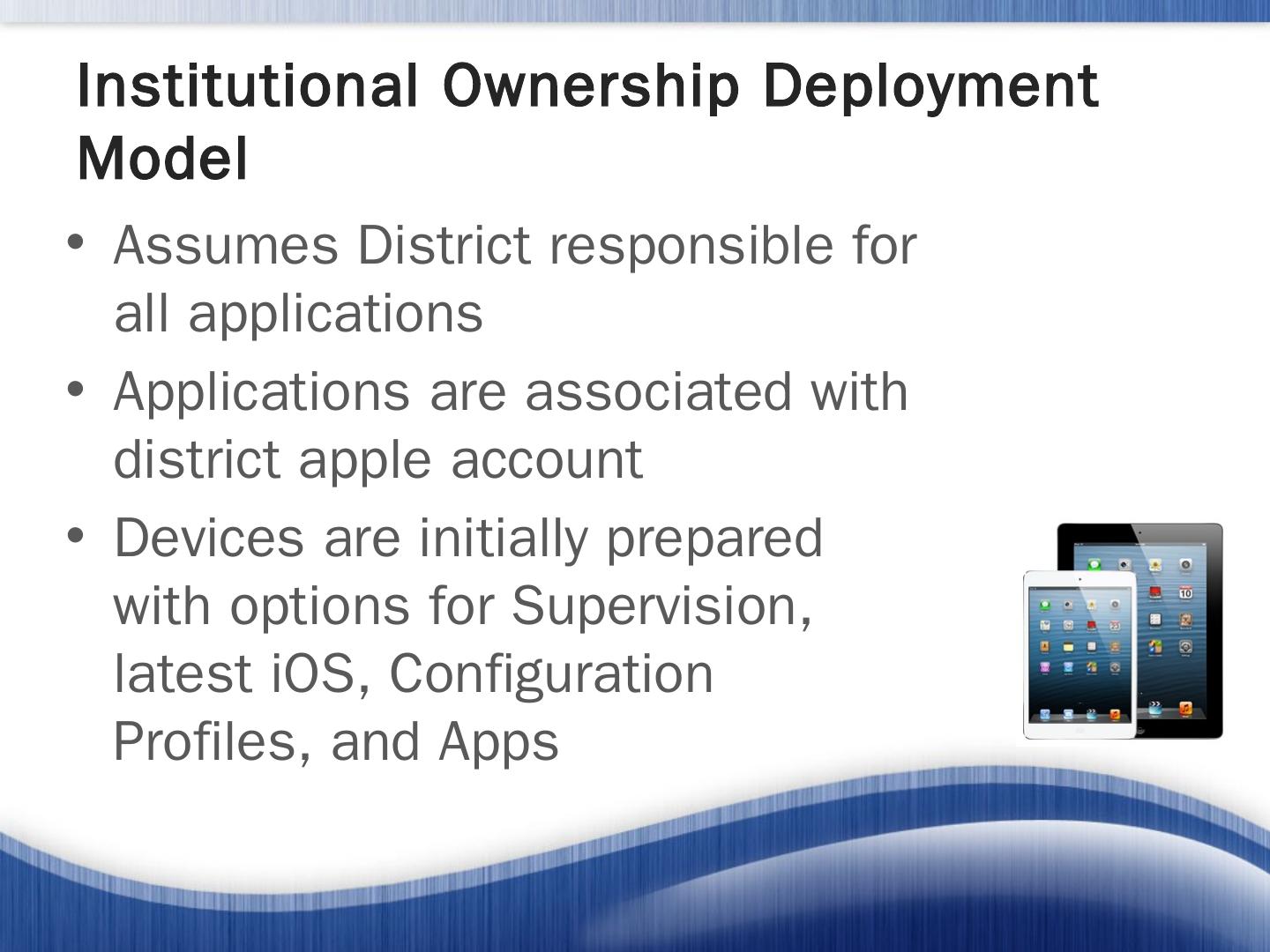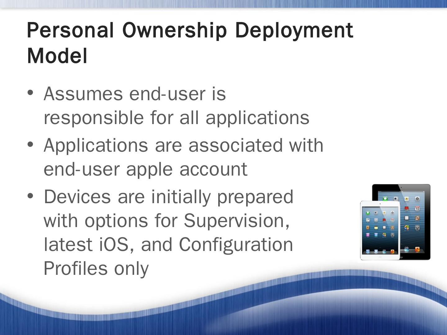 Apple iOS Deployment Models. Personal Ownership Deployment Model; Institutional Ownership Deployment Model; Layered Ownership Model. Personal ...