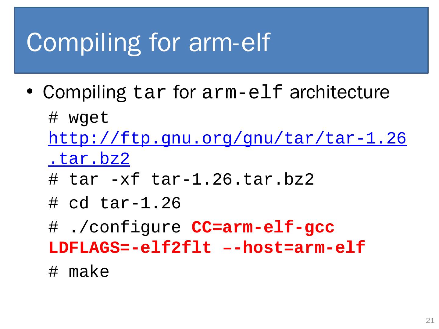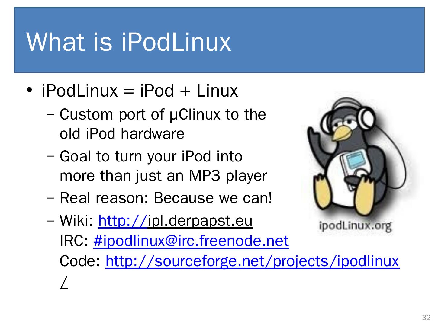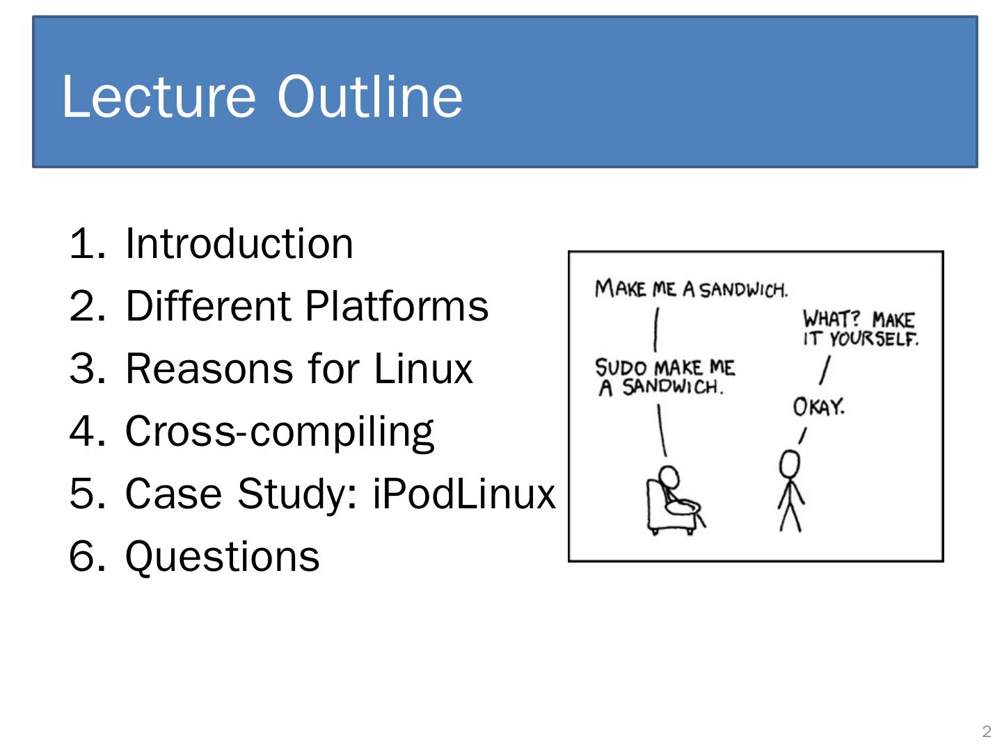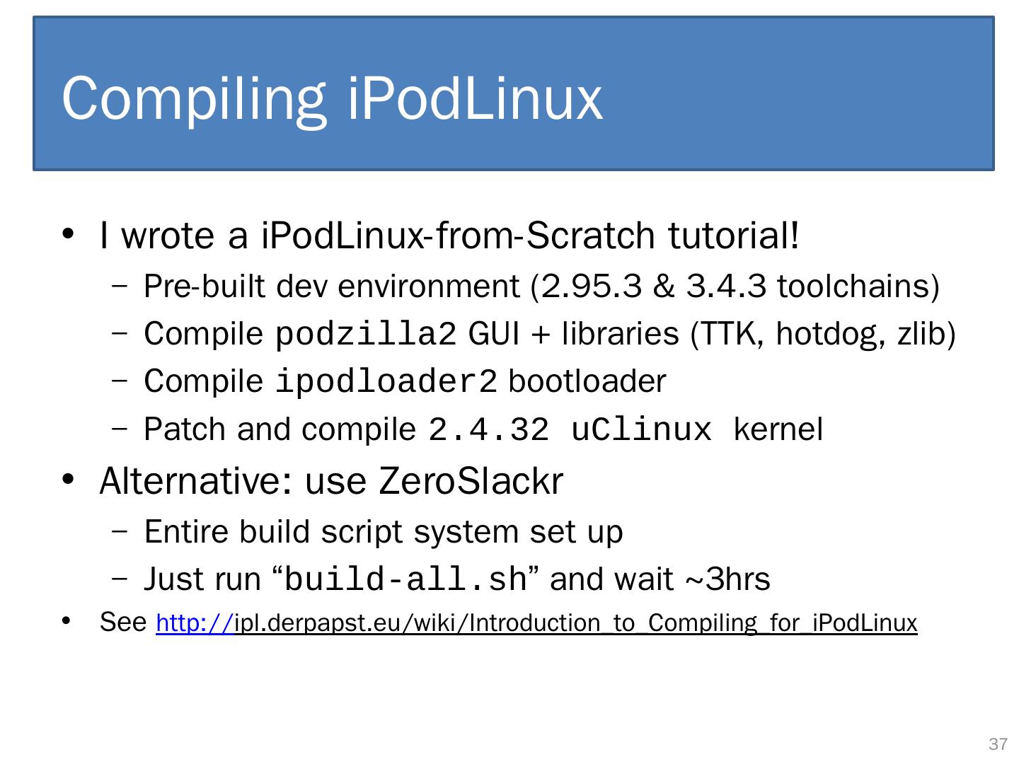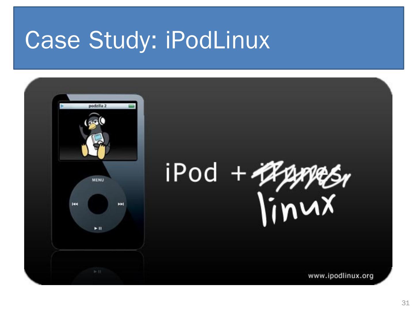 Introduction; Different Platforms; Reasons for Linux; Cross-compiling; Case Study: .... Compile ipodloader2 bootloader; Patch and compile 2.4.32 uClinux kernel.