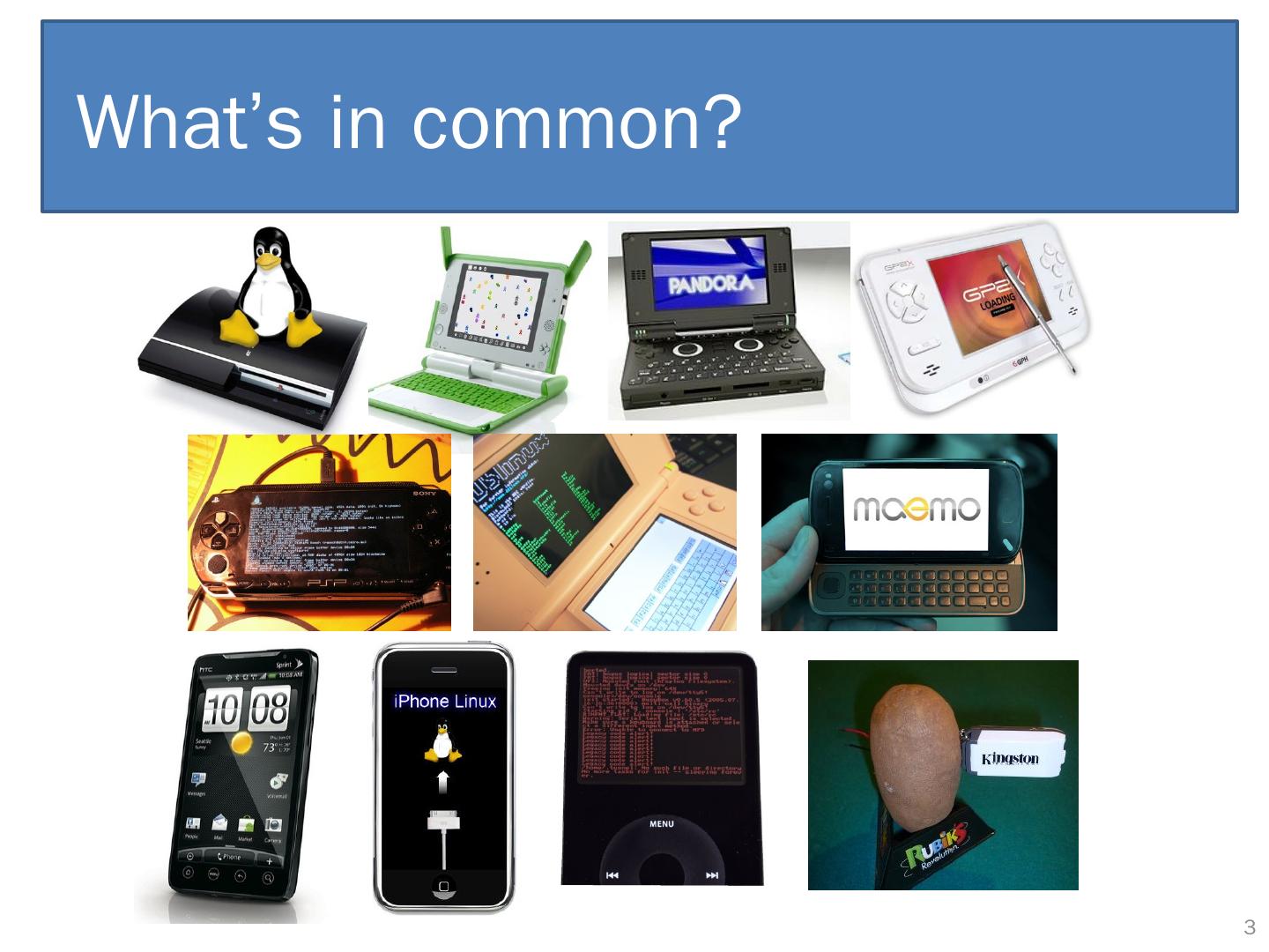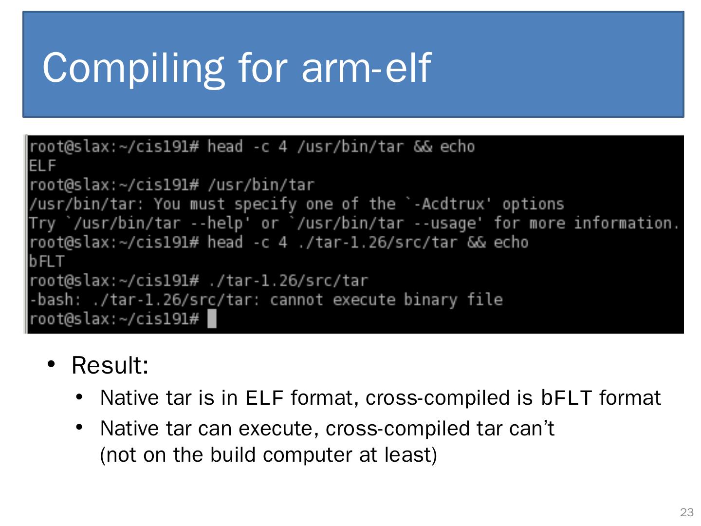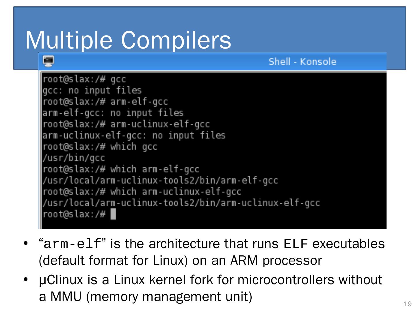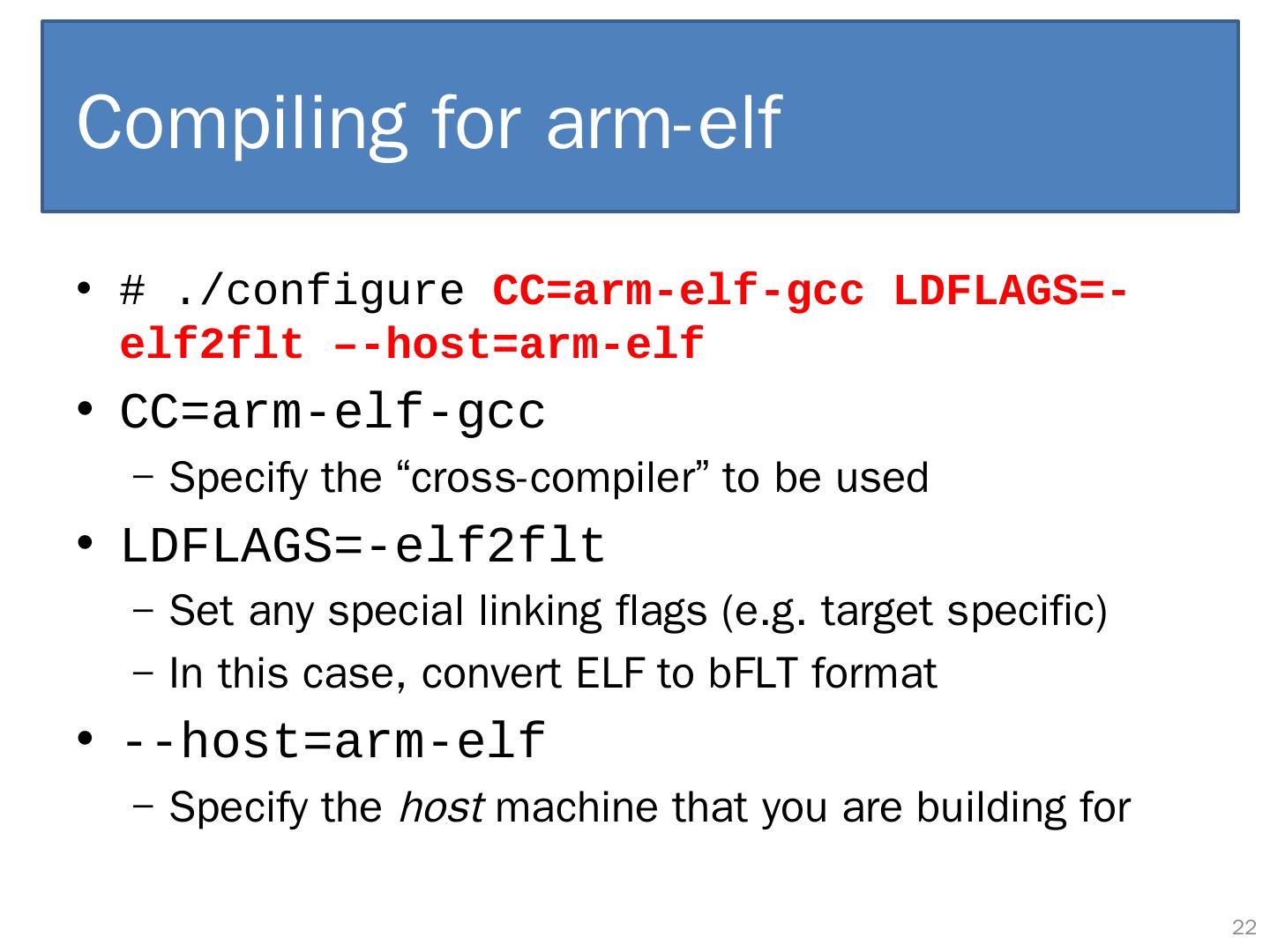 Introduction; Different Platforms; Reasons for Linux; Cross-compiling; Case Study: .... Compile ipodloader2 bootloader; Patch and compile 2.4.32 uClinux kernel.