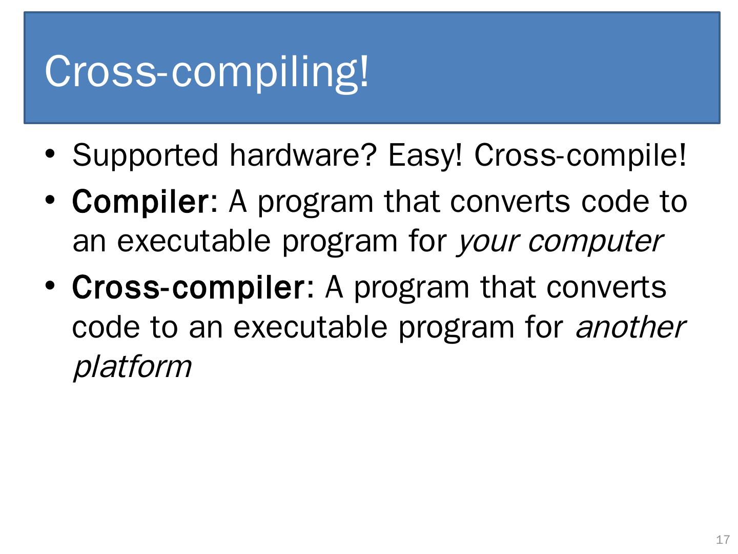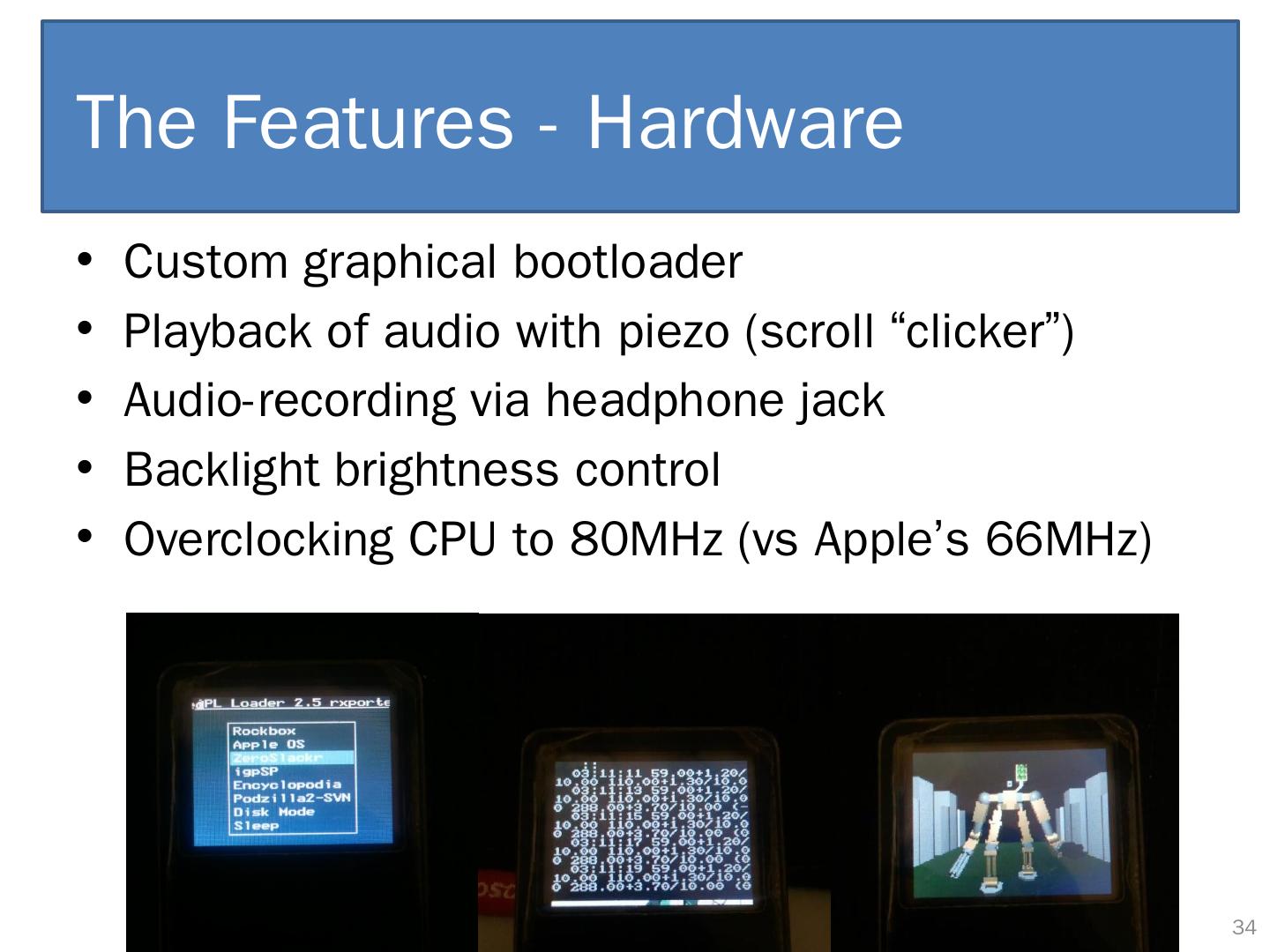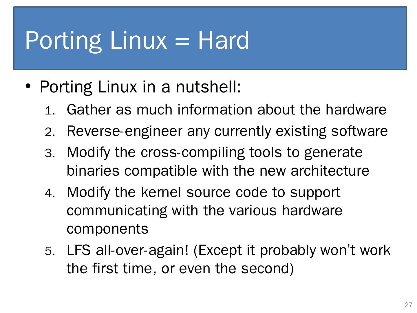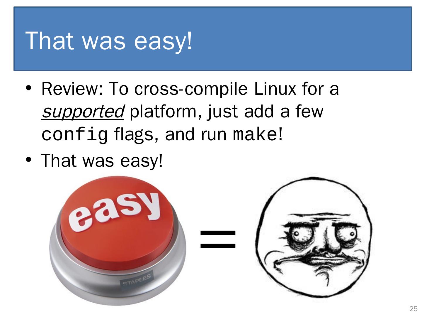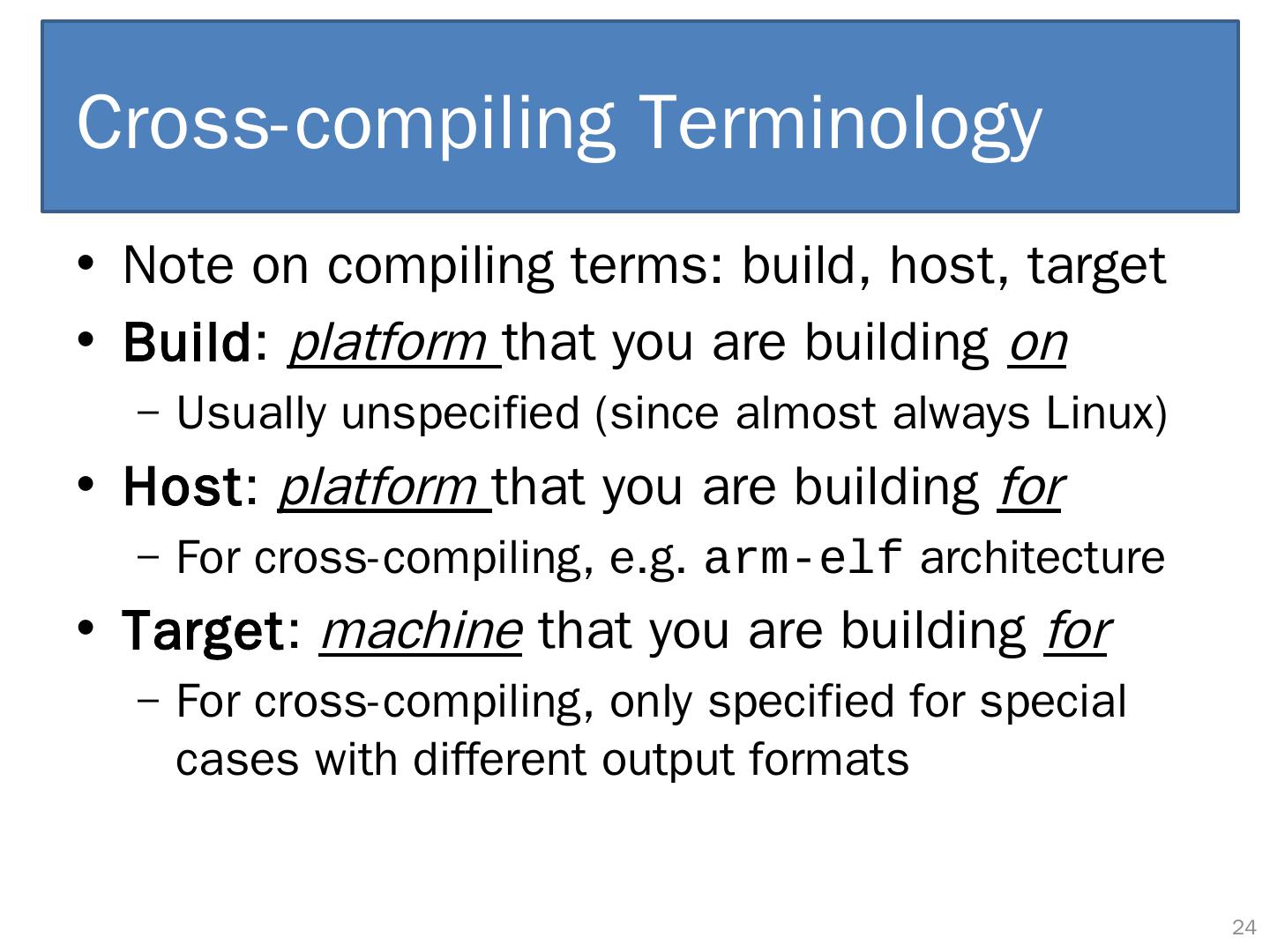 Introduction; Different Platforms; Reasons for Linux; Cross-compiling; Case Study: .... Compile ipodloader2 bootloader; Patch and compile 2.4.32 uClinux kernel.