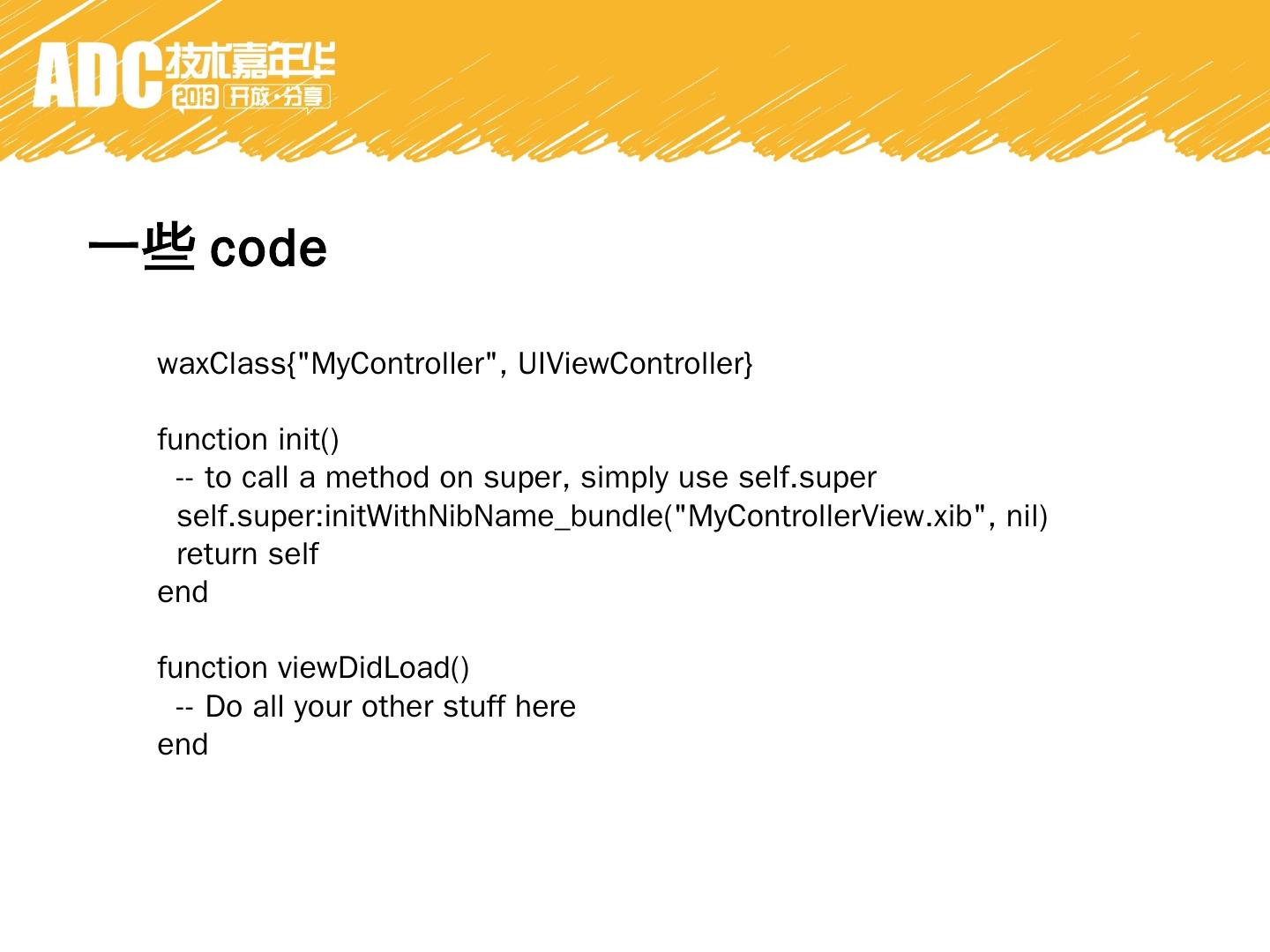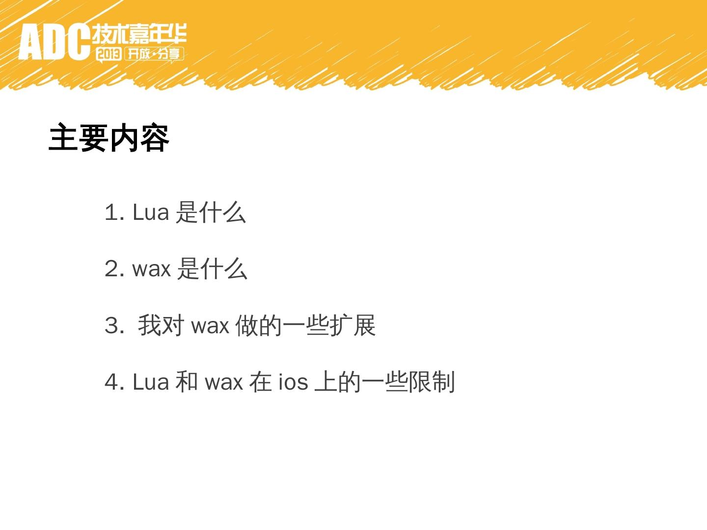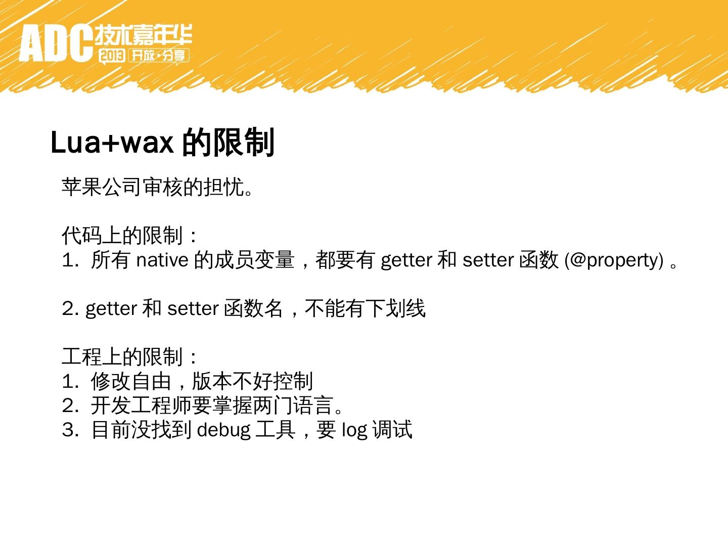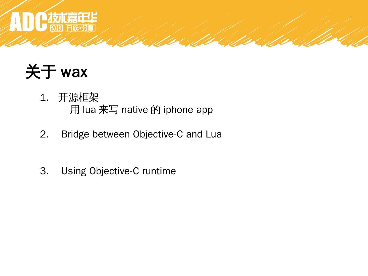 用lua来写native的iphone app. 2. Bridge between Objective-C and Lua. 3. Using Objective-C runtime. why wax. 1. 自动GC。 没有release retain. 2. 少写一些代码。