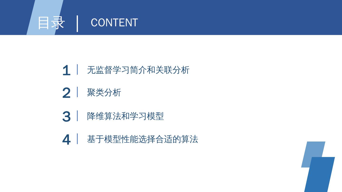 第6章无监督学习和算法选择. 认知计算与深度学习. 基于物联网云平台的智能应用. 目录. CONTENT. 1. 无监督学习简介和关联分析. 2. 聚类分析. 3. 降维算法和学习 ...