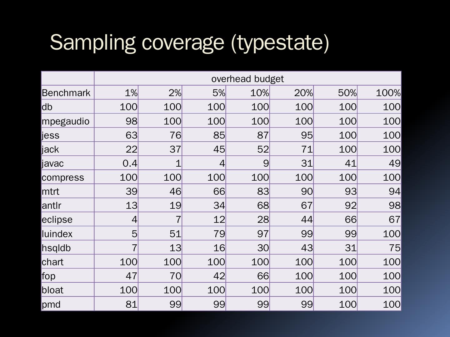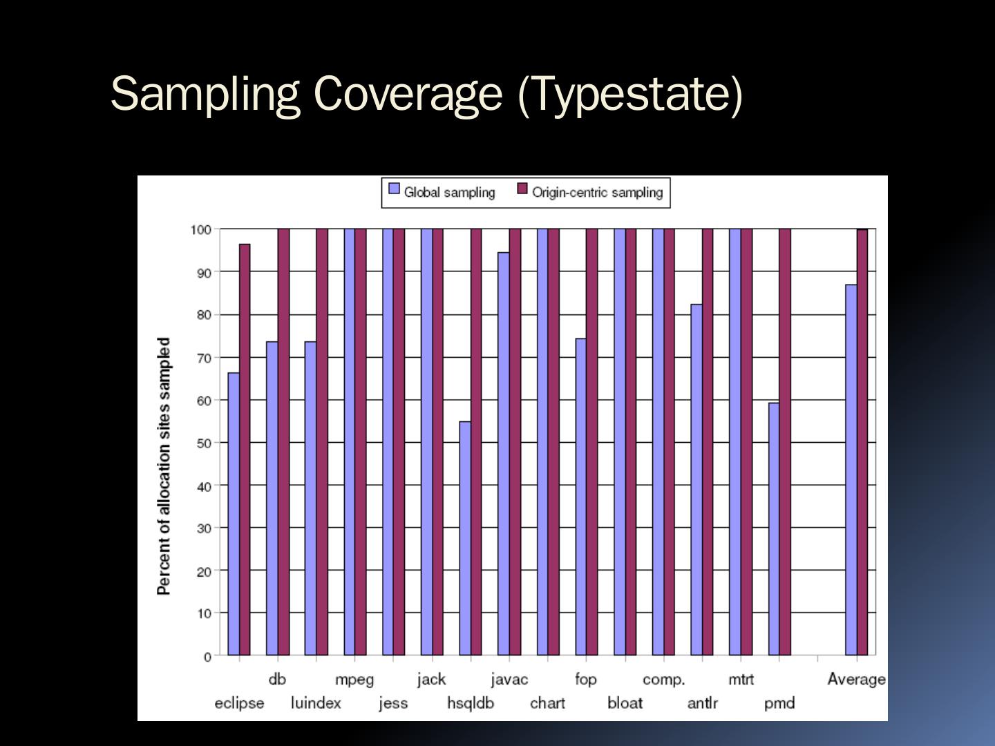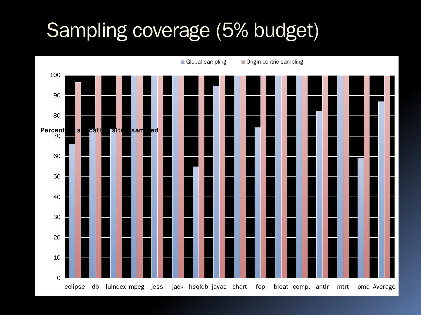 Origin-centric sampling. eclipse. db. luindex. mpeg. jess. jack. hsqldb. javac. chart. fop. bloat. comp. antlr. mtrt. pmd. Average. Percent of allocation sites sampled.