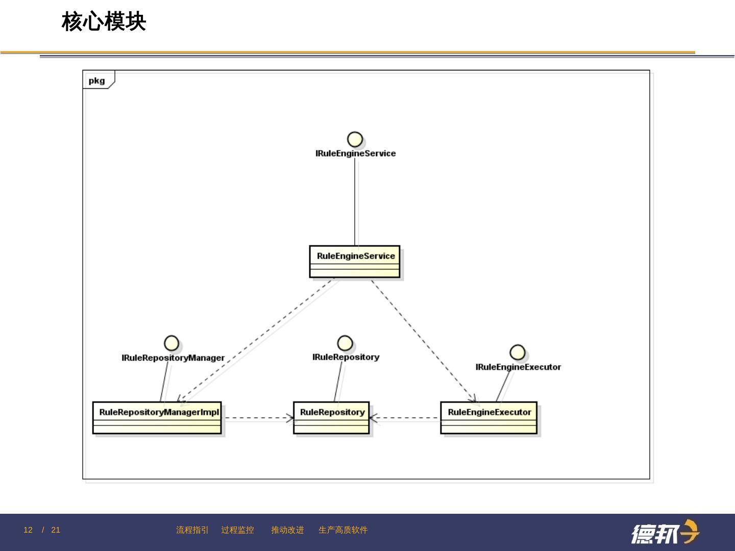 12 . 核心模块 12 / 21 流程指引 过程监控 推动改进 生产高质软件
